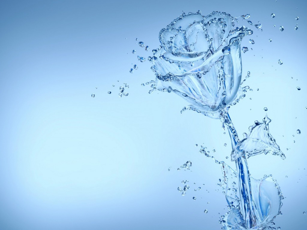 Description: A flower is being dropped into water with a blue background and a blue sky in the background with a few clouds.