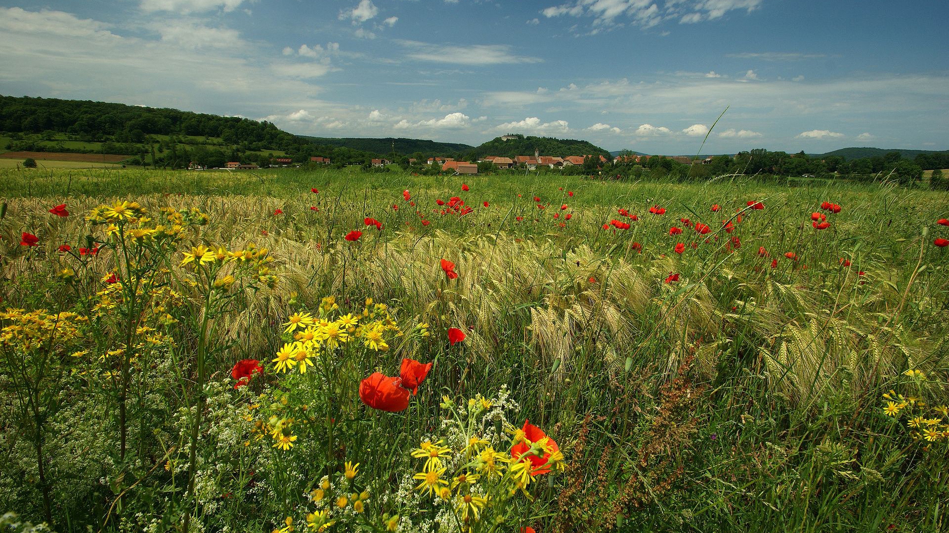 Description: A field of flowers and grass with a sky background and clouds in the background.