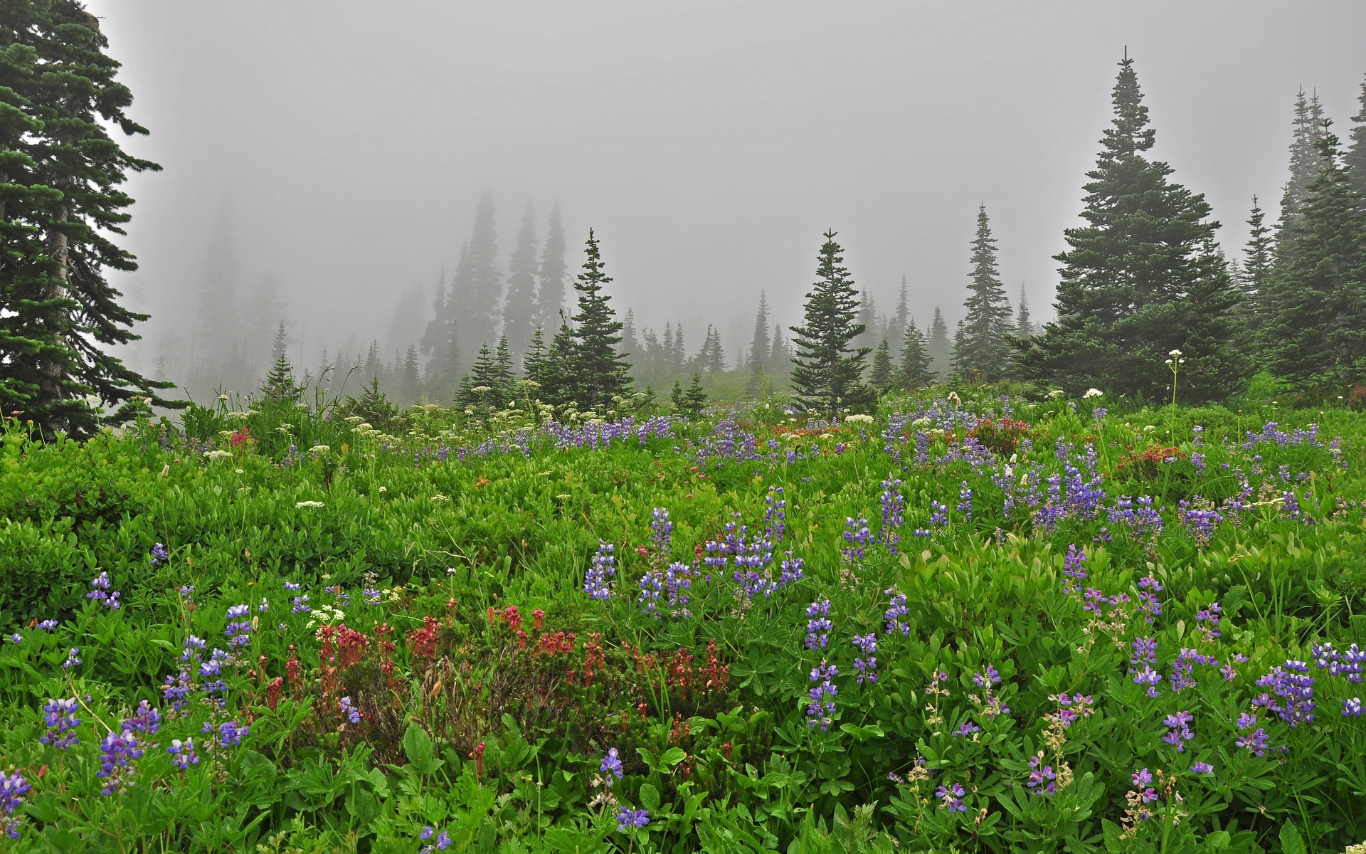 Description: A field of flowers and trees in the foggy weather with a few clouds in the sky above them.