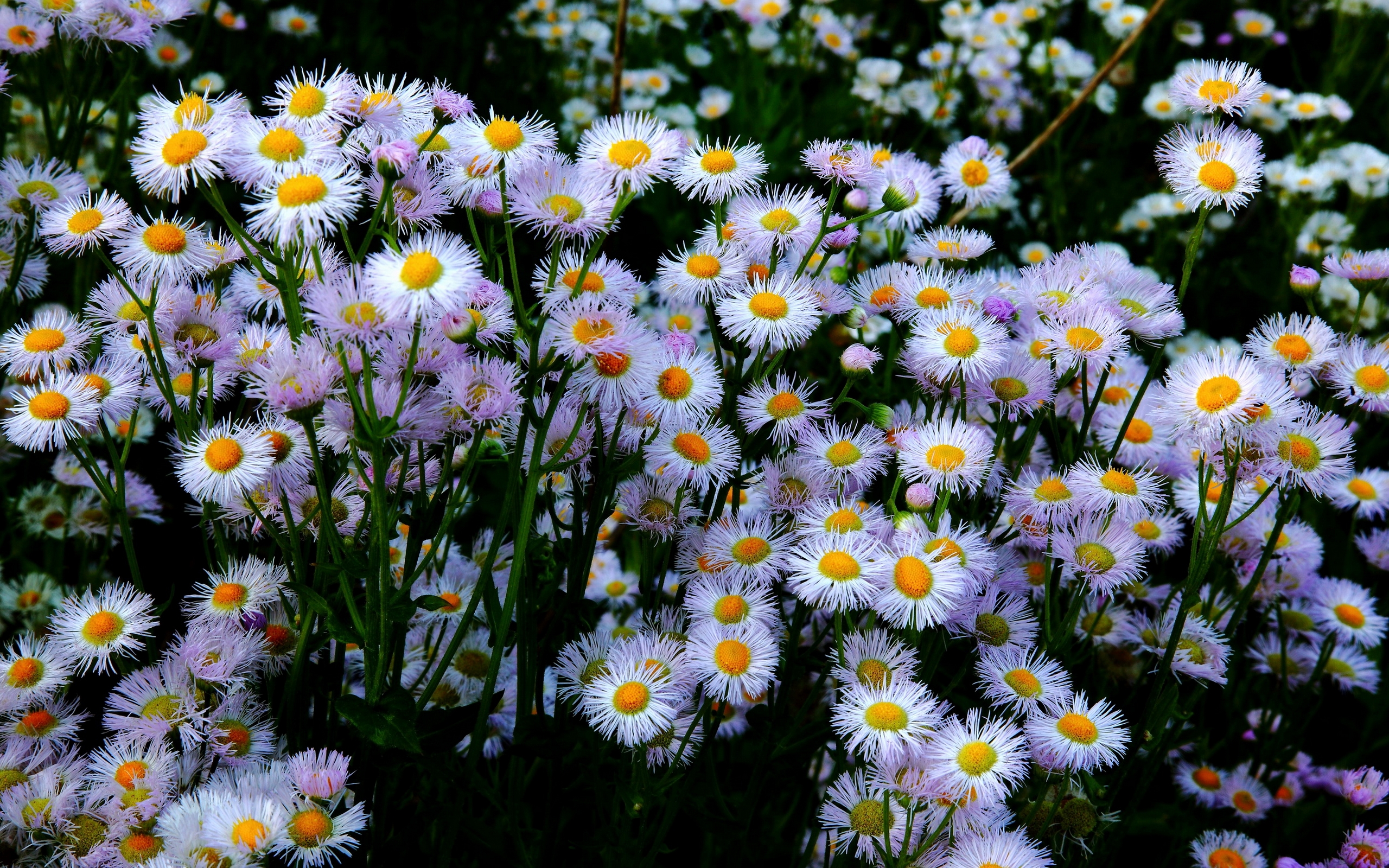 Description: A field of white and yellow flowers with green stems and yellow centers in the center of the field.