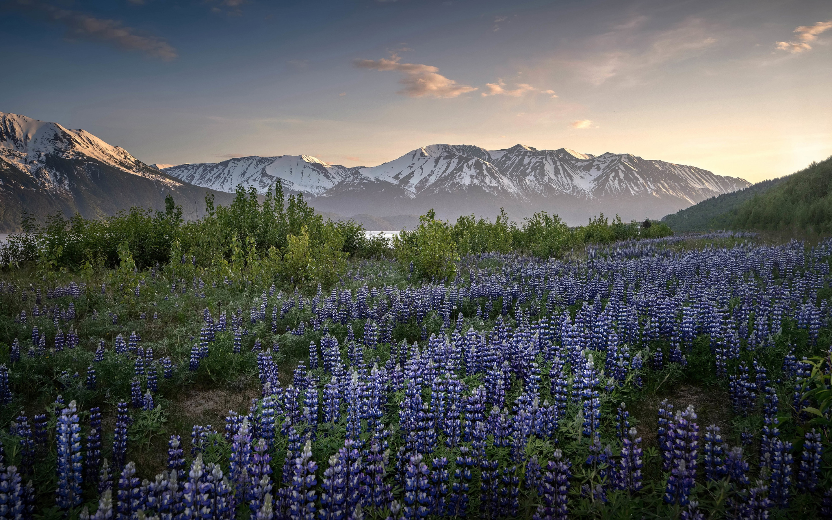 Description: A field of flowers with mountains in the background at sunset with a sky filled with clouds and snow capped mountains.