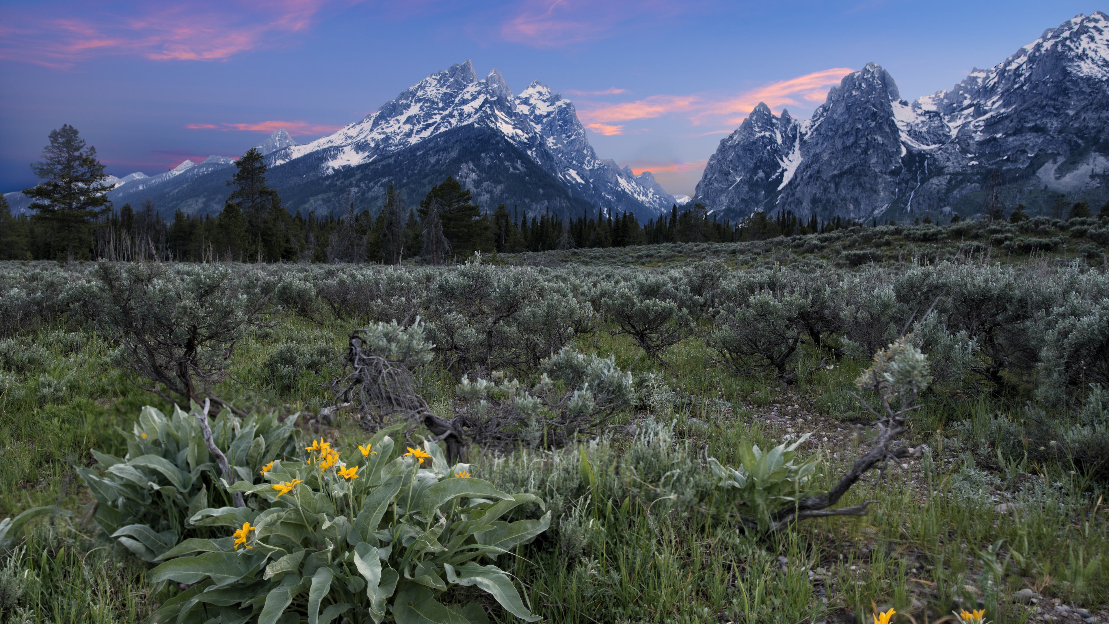 Description: A field with flowers and mountains in the background at sunset with a pink sky and clouds in the distance.