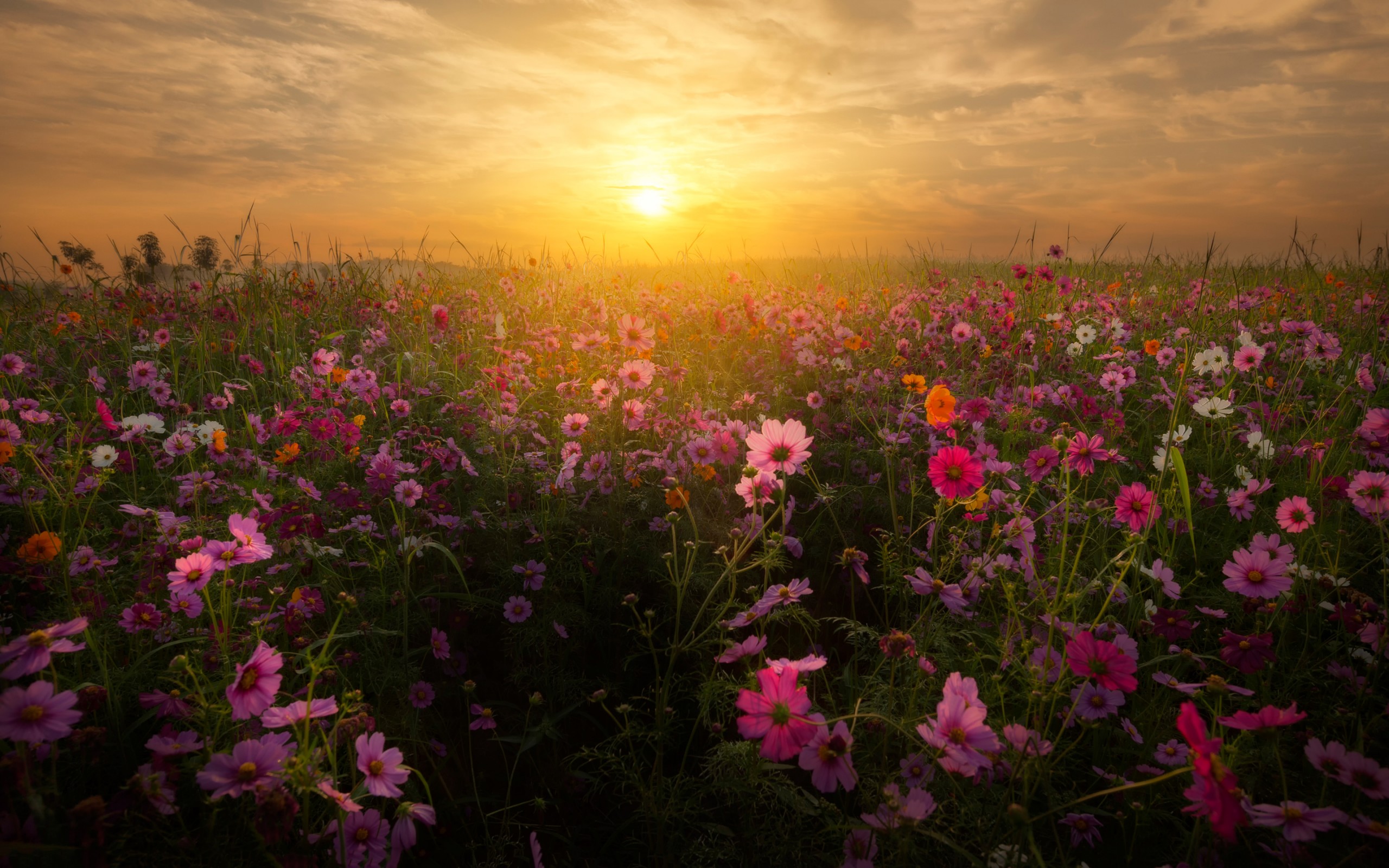 Description: A field of flowers with the sun setting in the background and clouds in the sky above it.