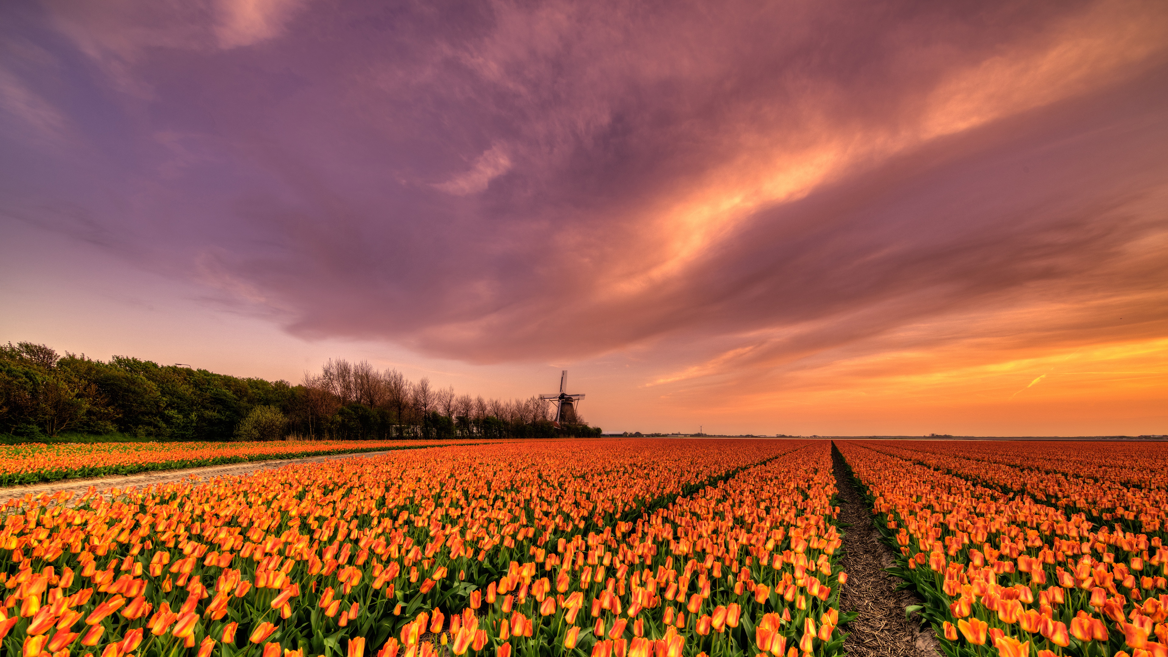 Description: A field of flowers with a sunset in the background and a windmill in the distance in the distance.
