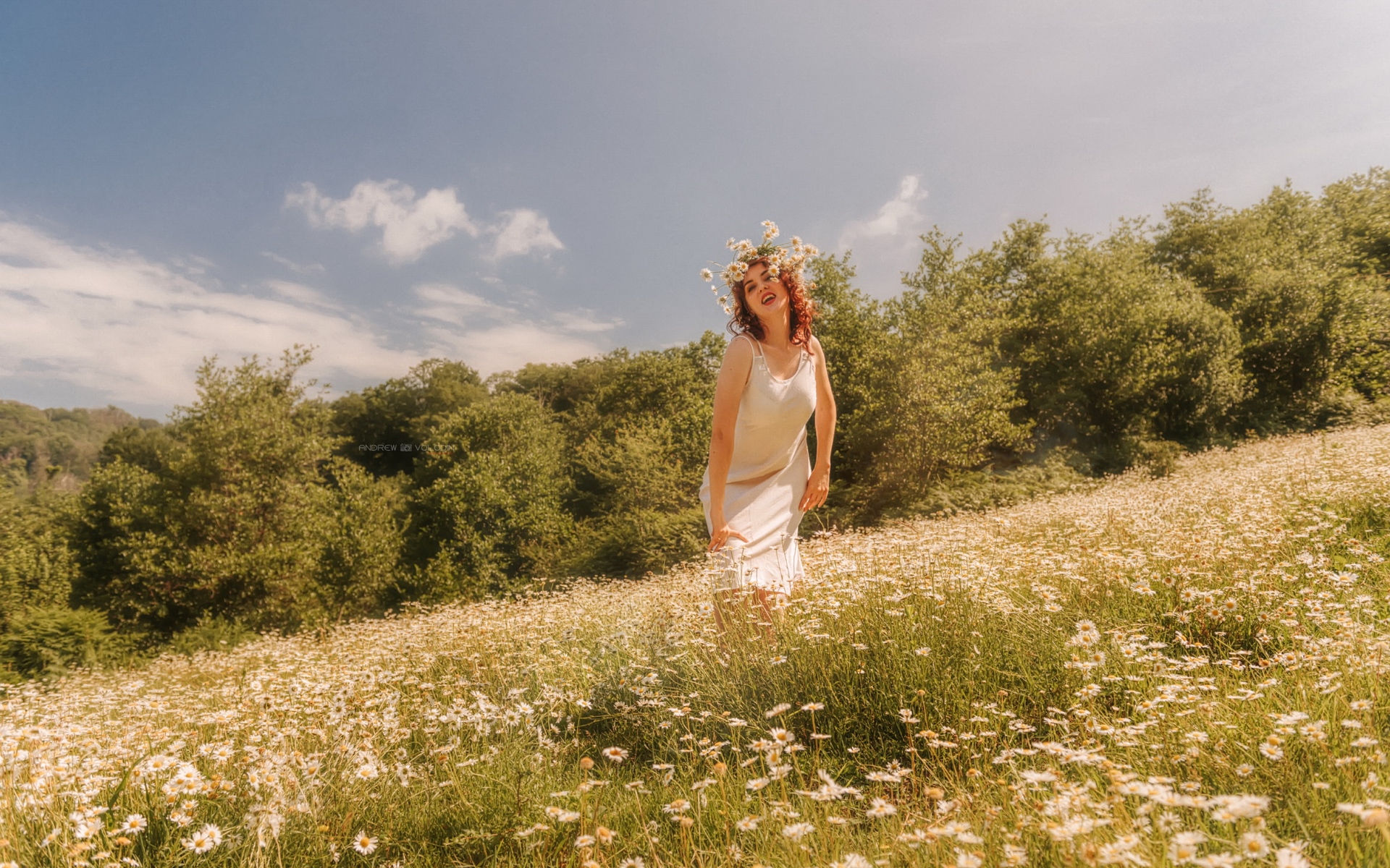 Description: A woman in a field of flowers with a frisbee in her hand and a sky background with clouds.