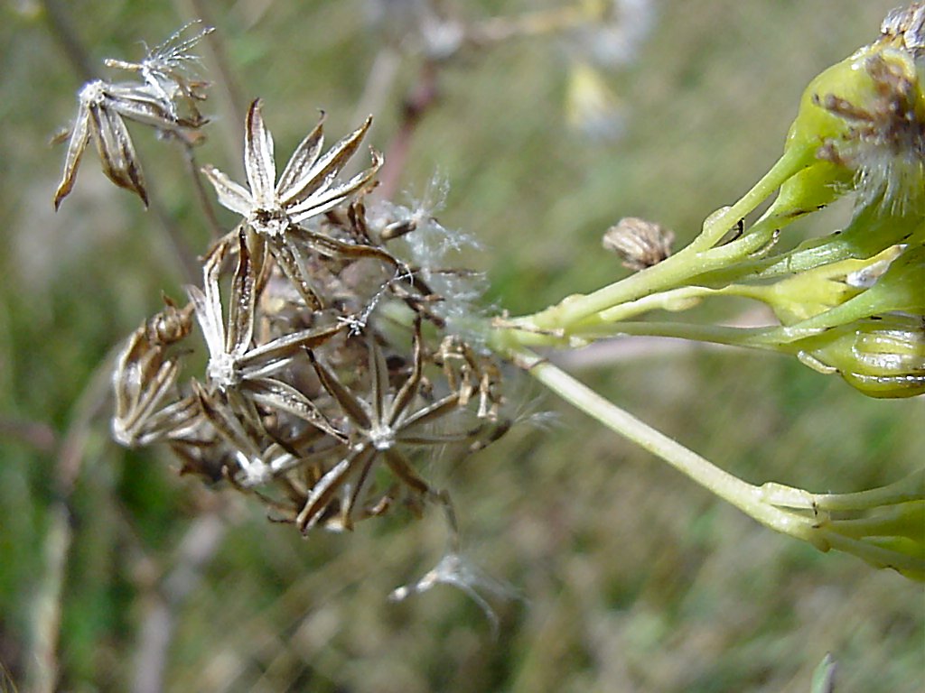 Description: A close up of a flower with a blurry background of grass and weeds in the background.
