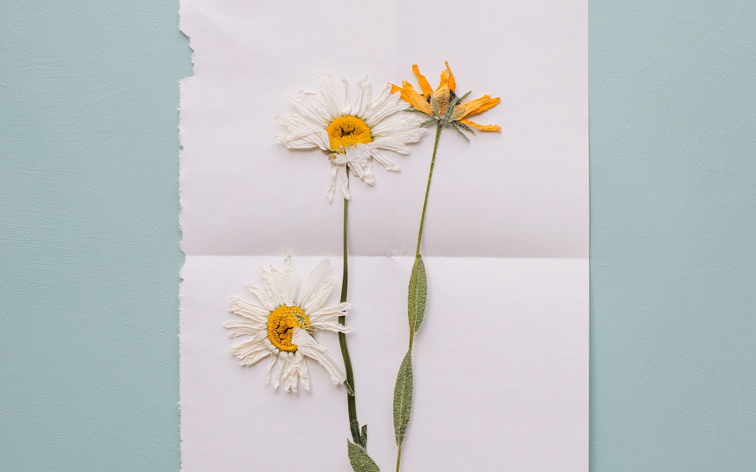 Description: Two flowers are on a piece of paper with a green stem and yellow center on the end of the flower.