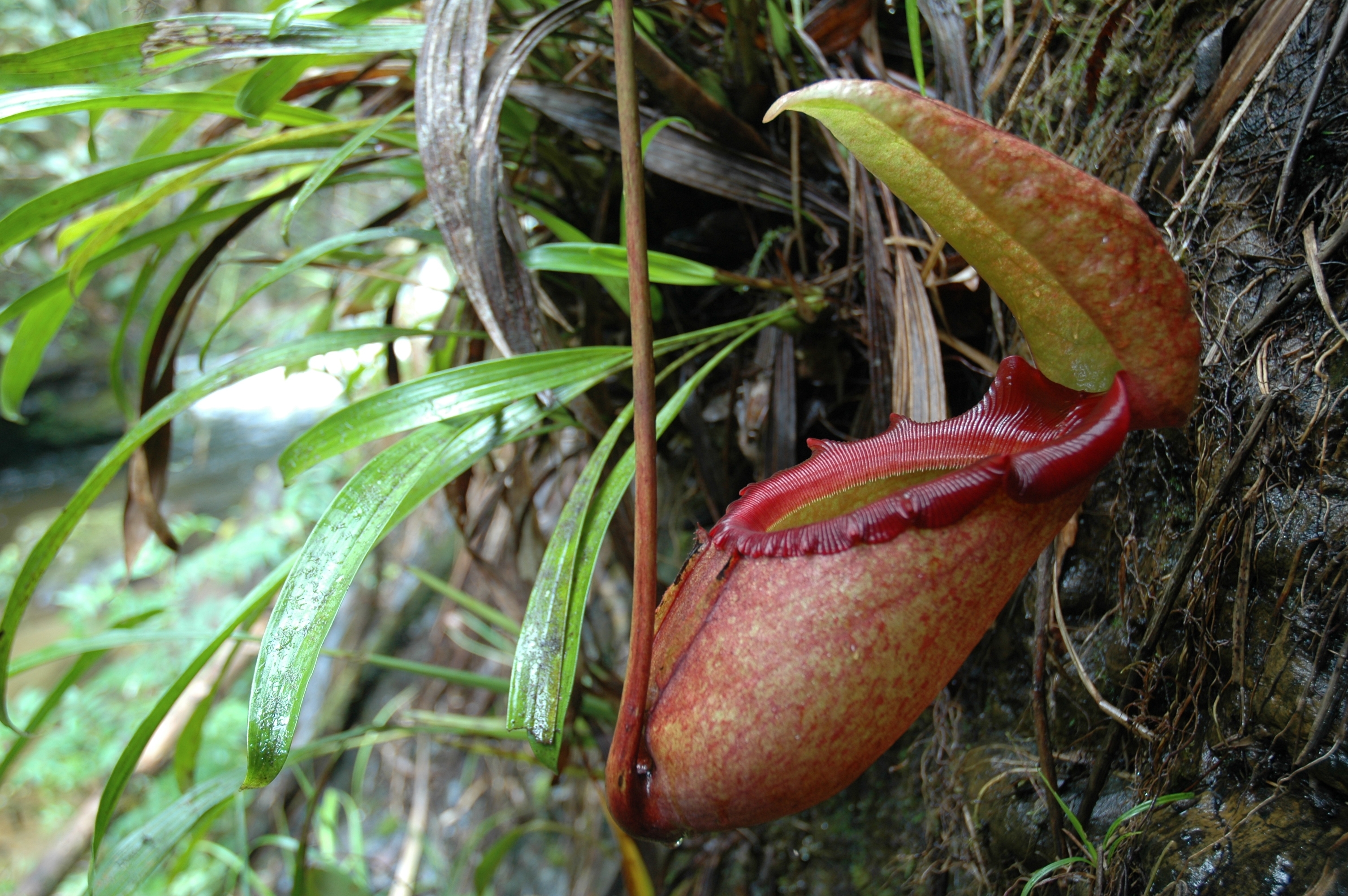Description: A flower with a red substance on it hanging from a tree branch in a forest with green leaves and a stream.
