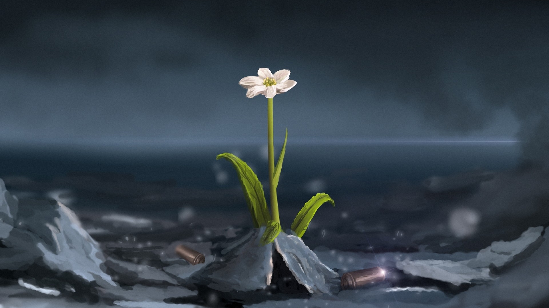 Description: A single flower is growing out of a rock formation in the snow with a dark sky in the background.