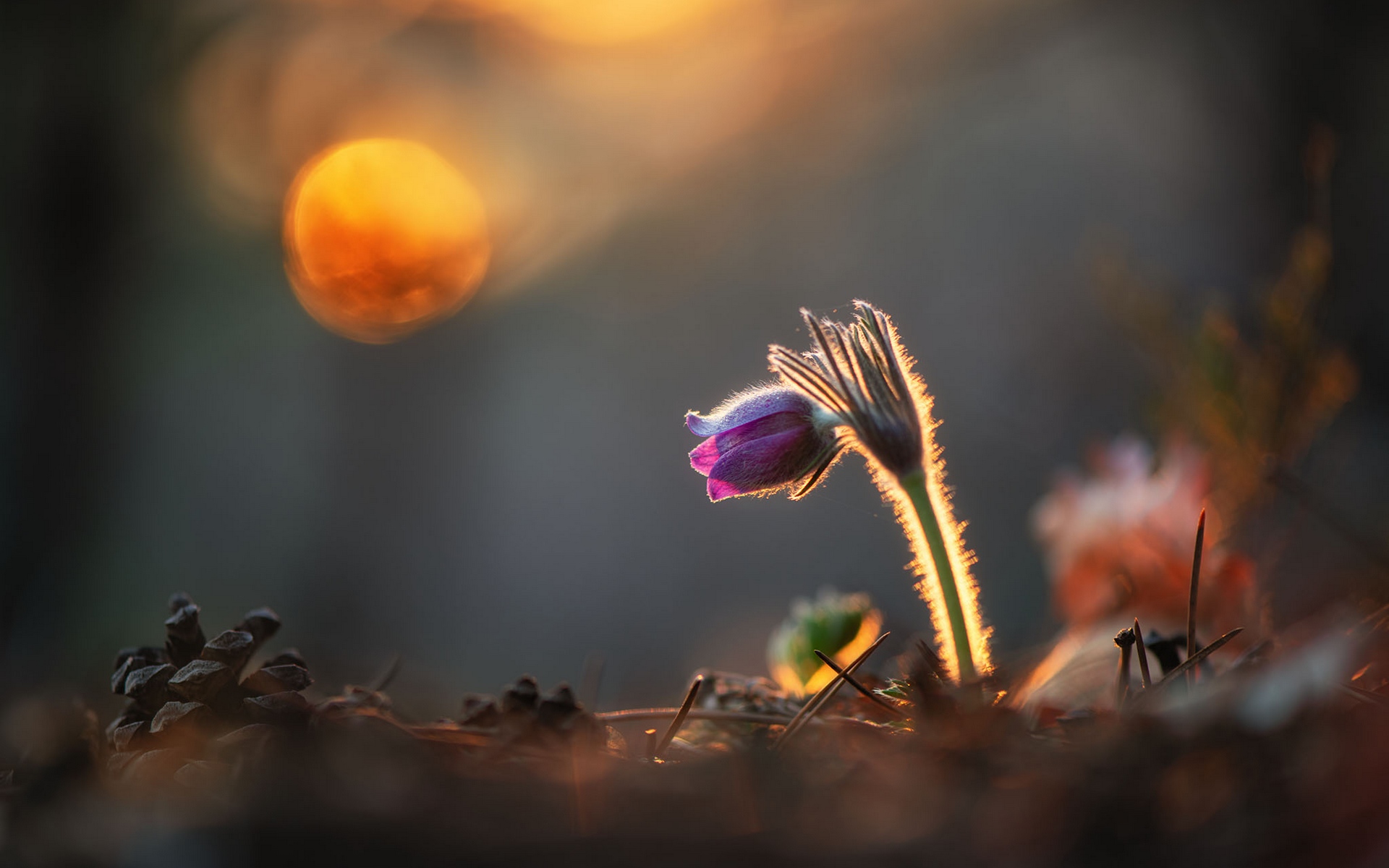 Description: A single flower is growing out of the ground in the sun light of the setting sun.