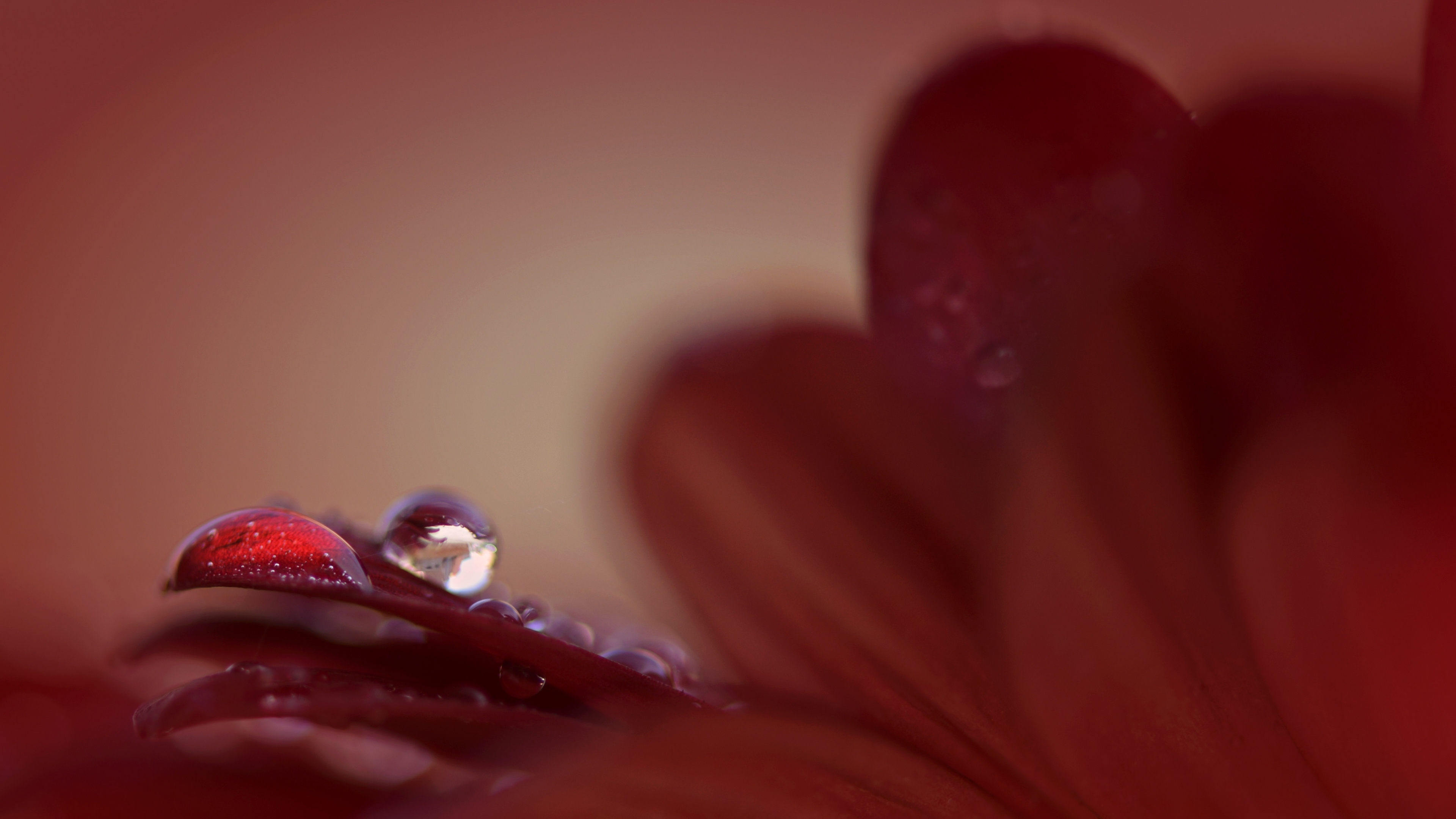 Description: A close up of a flower with water droplets on it's petals and a red background with a white center.