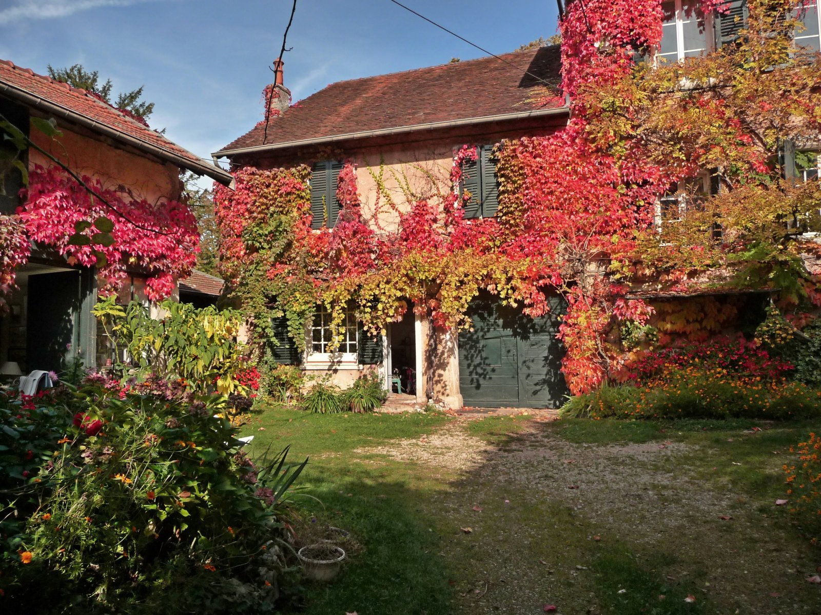 Description: A house with a lot of flowers on the outside of it and a lot of trees in front of it.