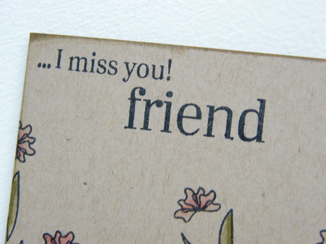 Description: A card with a picture of flowers on it that says i miss you friend on it and a cat sitting on the back of the card.