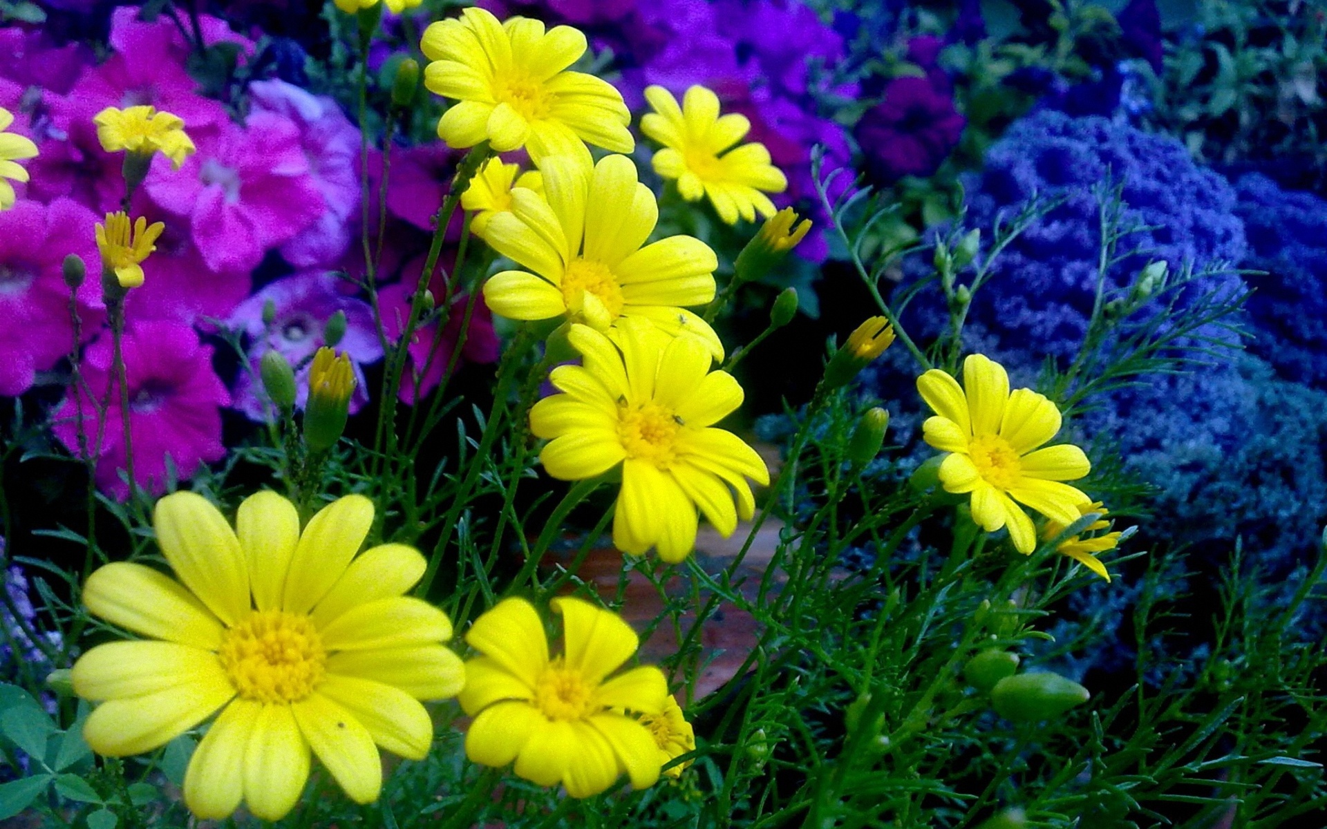 Description: A bunch of flowers that are in the grass together and some are purple and yellow flowers in the background.