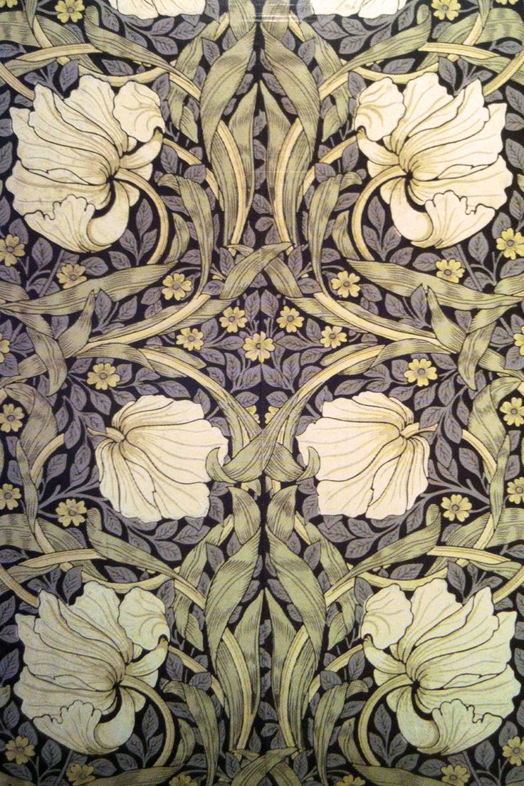 Description: A painting of flowers and leaves on a wallpapered surface with a pattern of vines and flowers on the wall.