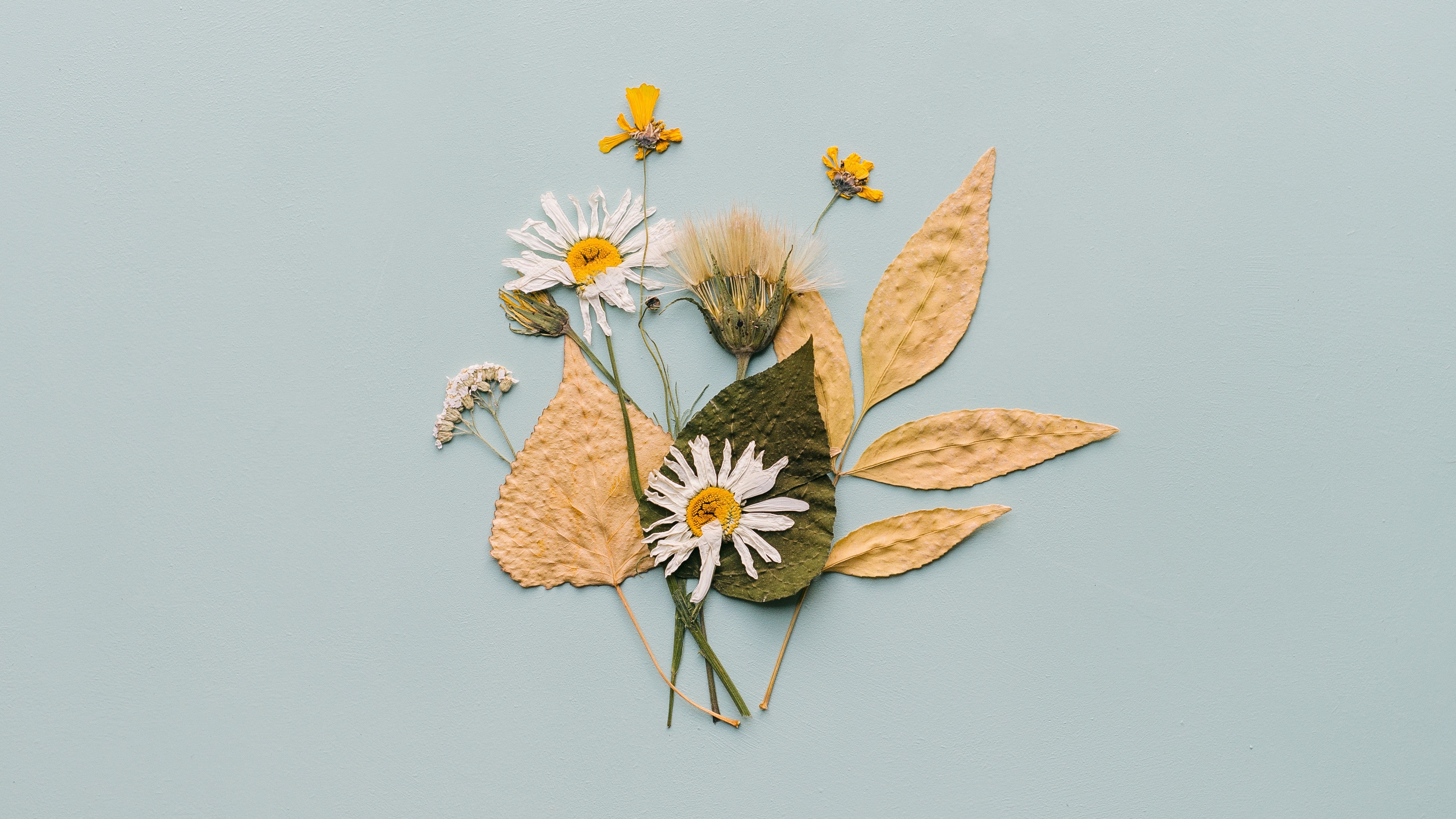 Description: A group of flowers that are on a table together with leaves and flowers on it.