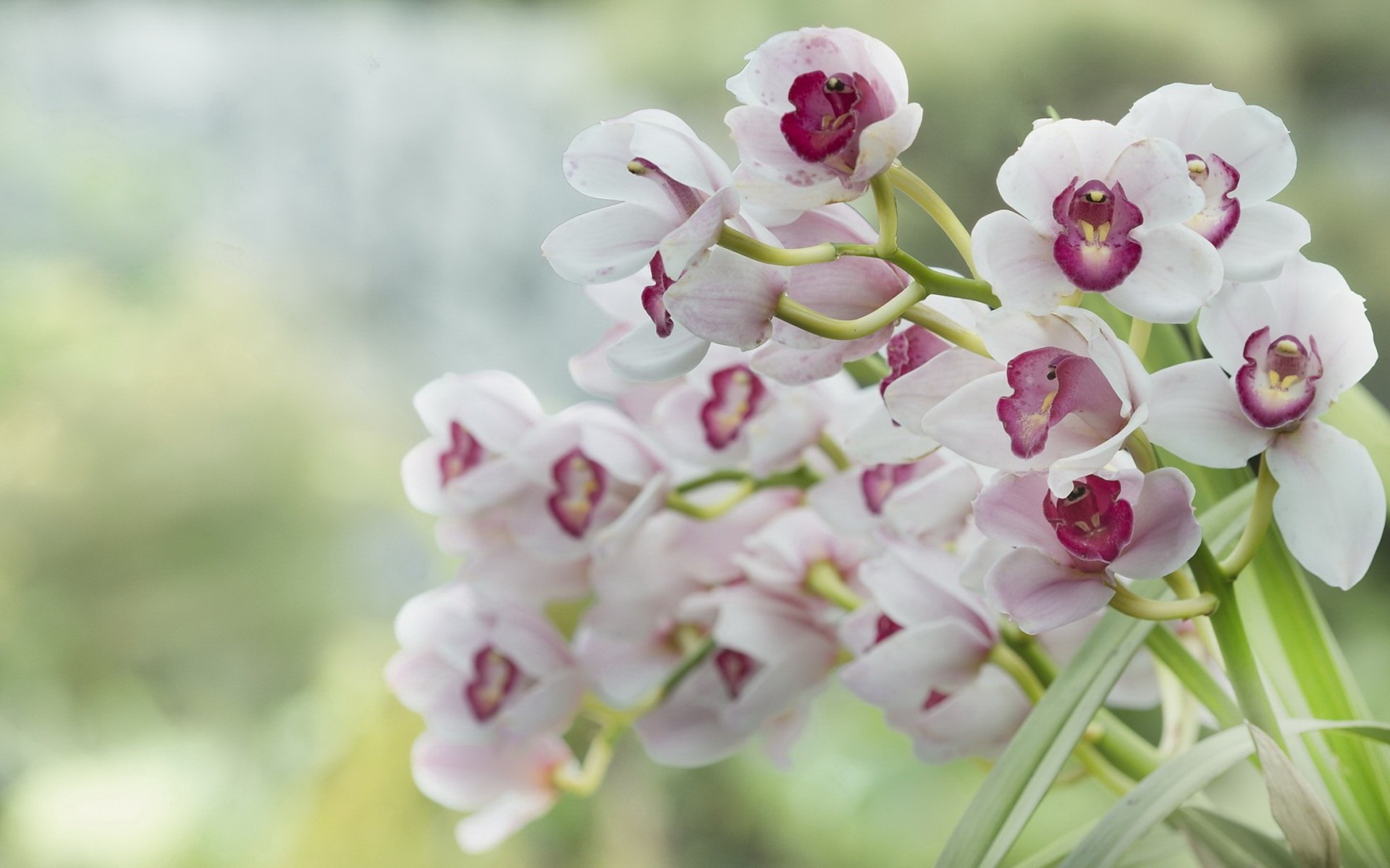 Description: A bunch of flowers that are in a vase on a table with a blurry background of trees and bushes.