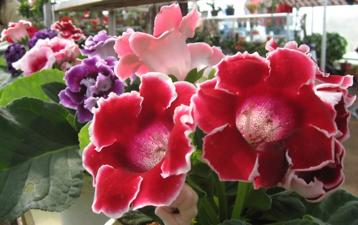 Description: A bunch of flowers that are in a vase on a table in a store or greenhouse with green leaves.