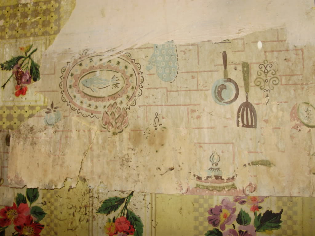 Description: A wall with a bunch of flowers on it and a painting on it that has a utensil and a spoon on it.