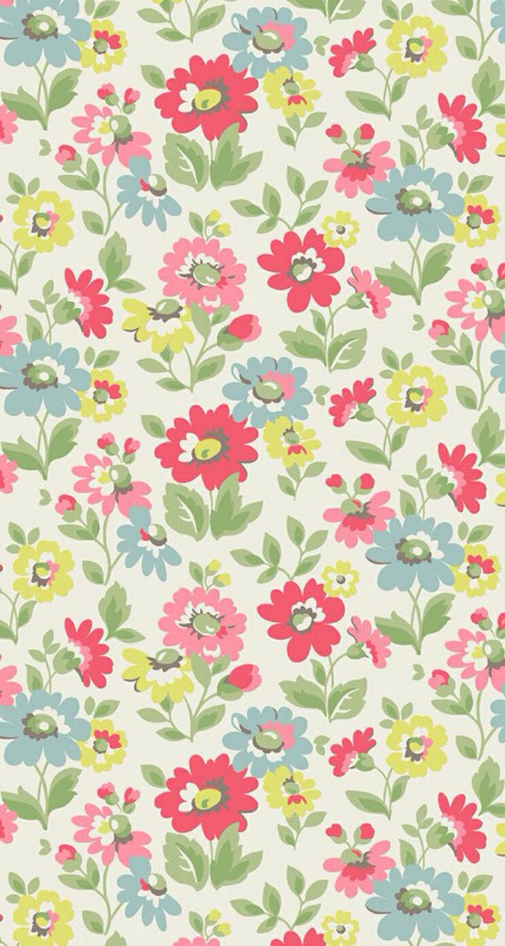 Description: A flowery pattern with many different colors and sizes of flowers on a white background with green leaves and red.