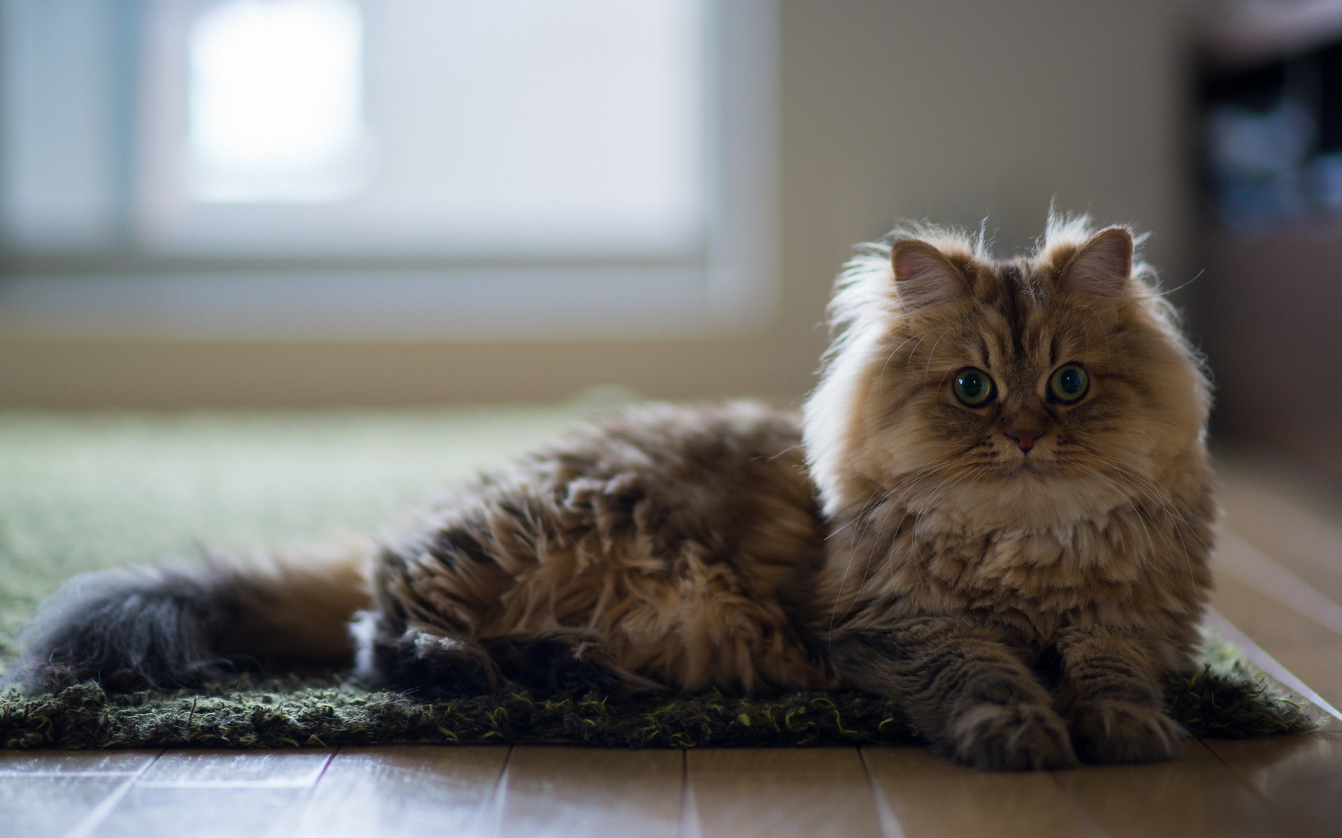 Description: A fluffy cat laying on a rug on the floor in a room with a window in the background and a green carpet.