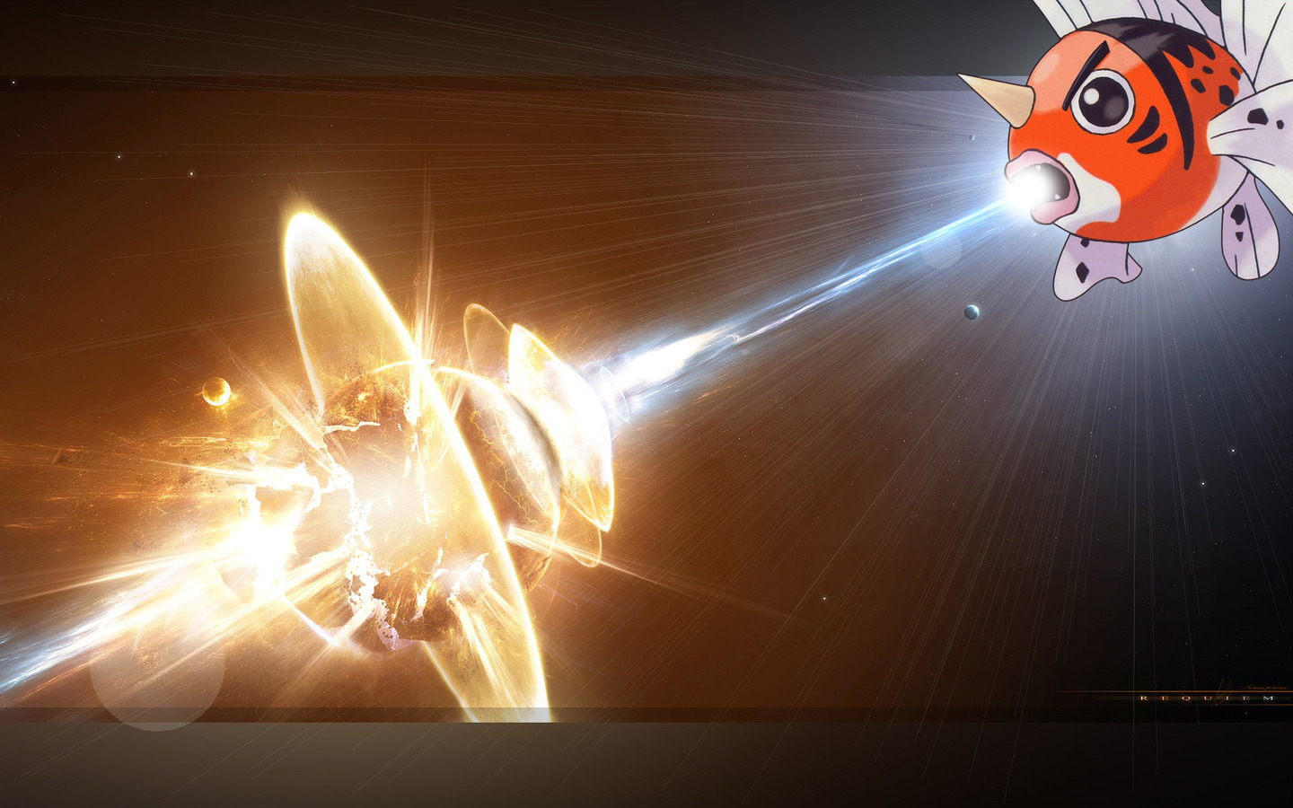 Description: A fish flying through the air next to a light beam with a fish on it's back end.