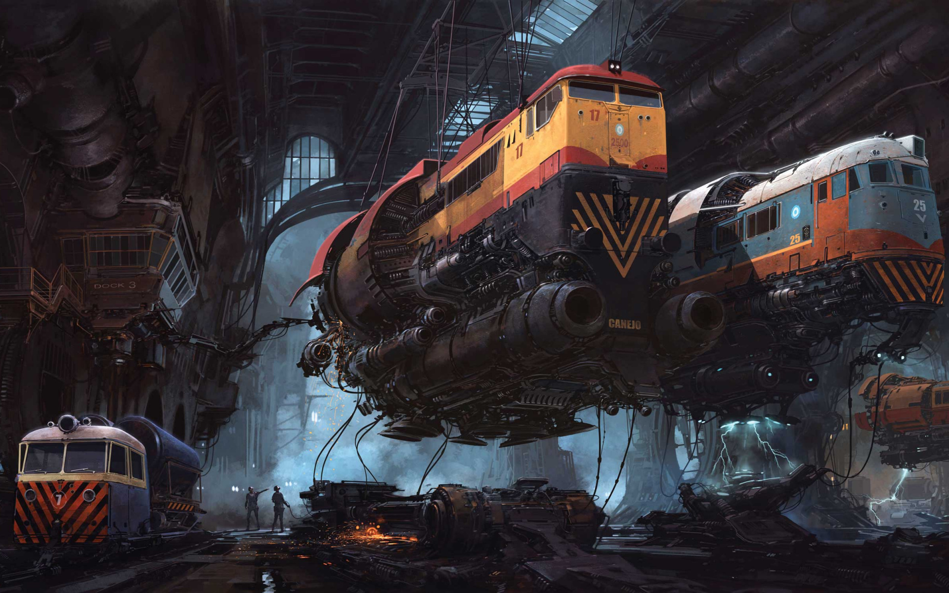 Description: A train is flying through a large industrial building with a train on it's side and a train on the ground.