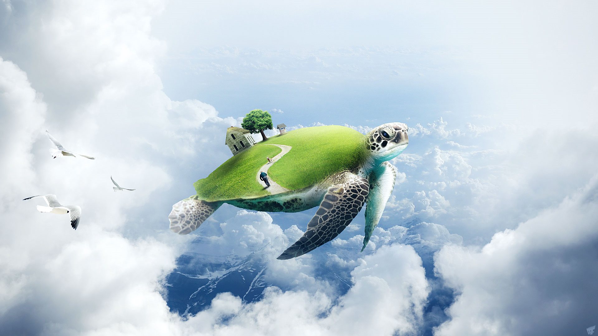 Description: A turtle flying through the air with a house on its back and a tree on its head on top of it.