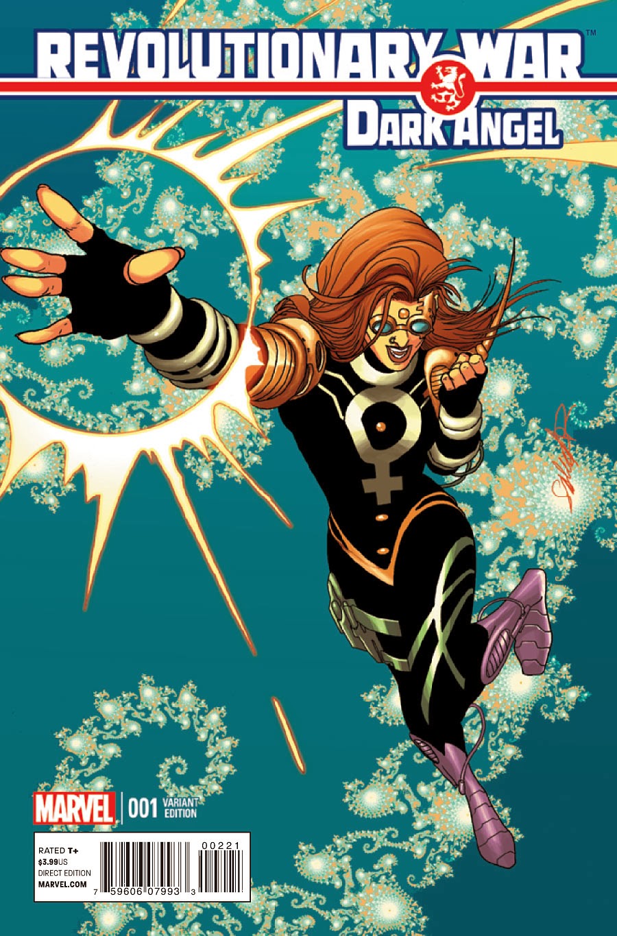 Description: A woman in a black and white outfit flying through the air with her arms out and her hands out.