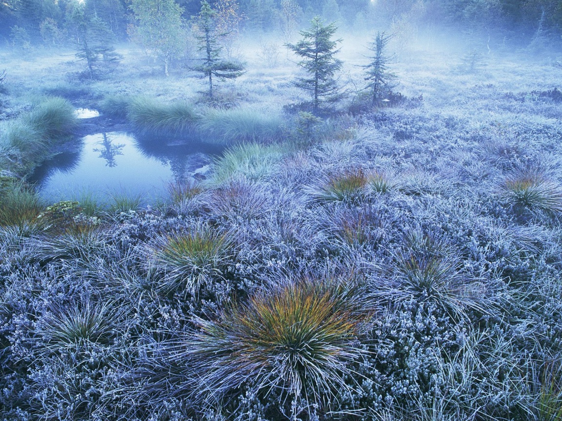 Description: A foggy field with a stream and trees in the background and a foggy sky above it and a pond in the middle.