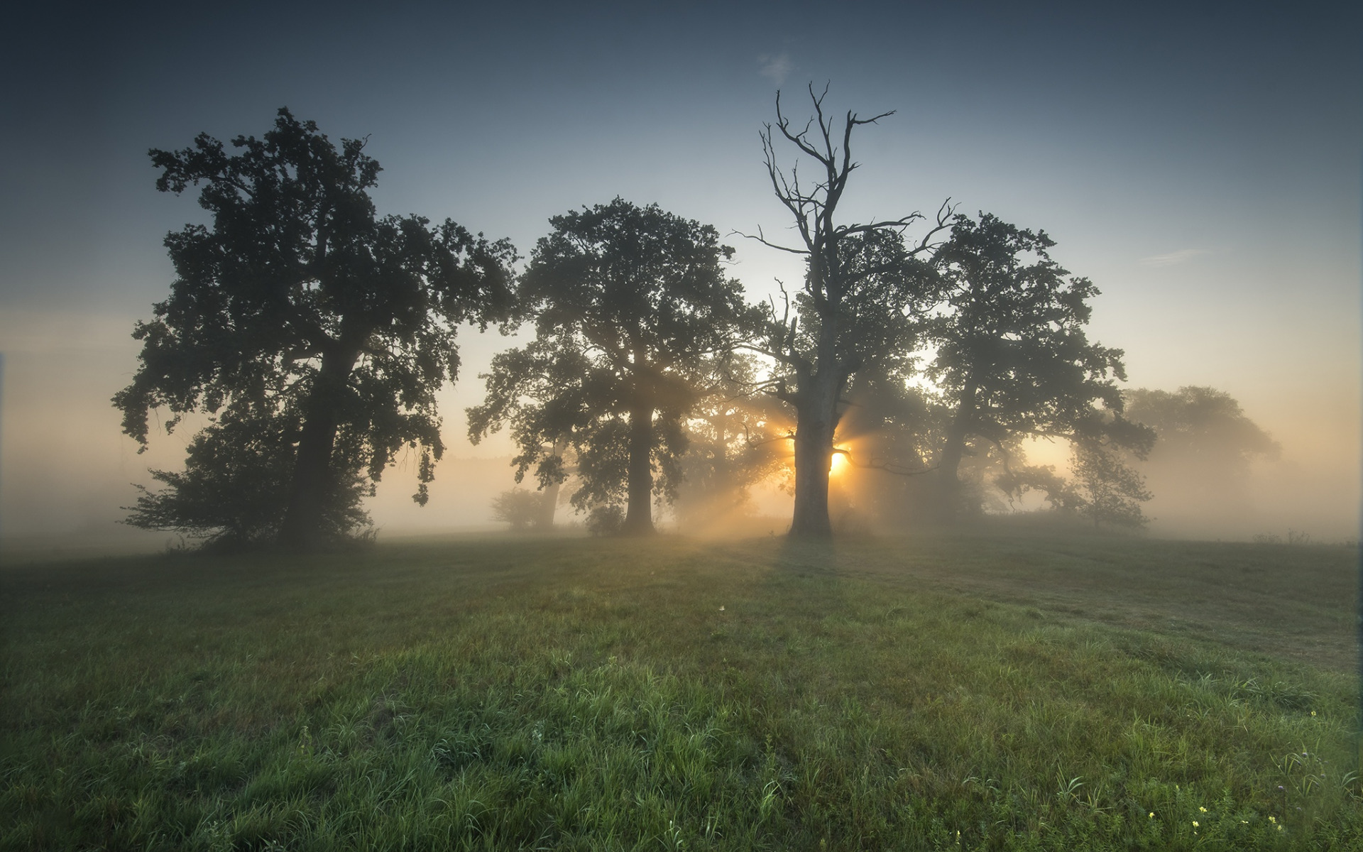 Description: A foggy field with a tree and sun shining through the foggy trees on a foggy day.