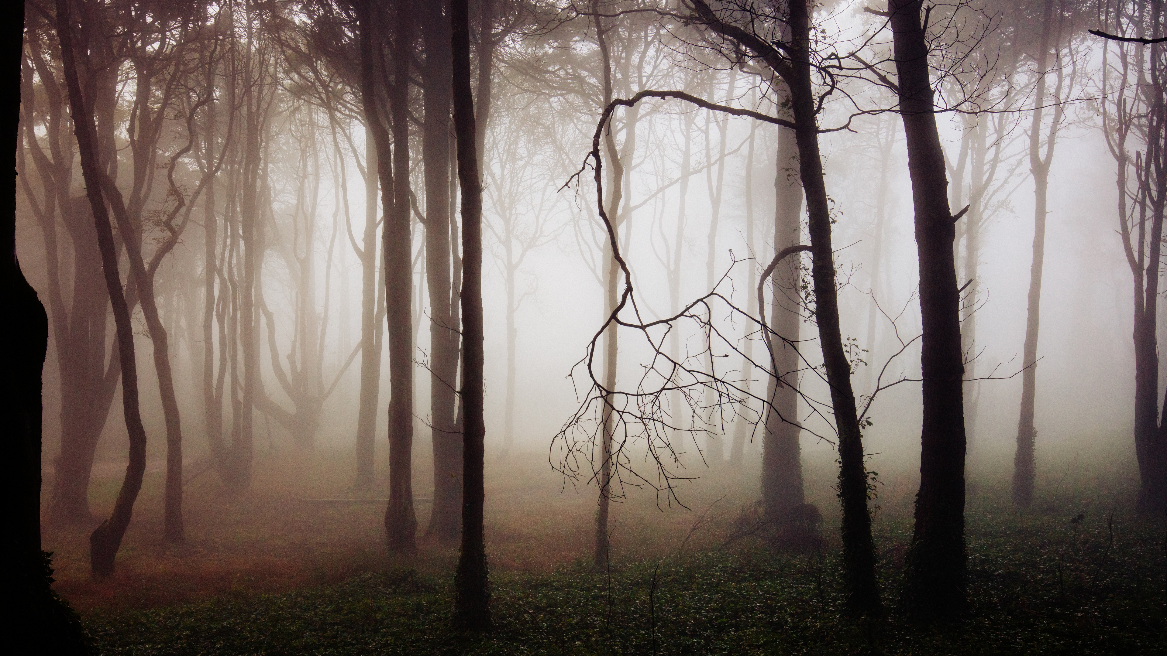 Description: A foggy forest with trees and grass in the foreground and a few branches in the foreground.