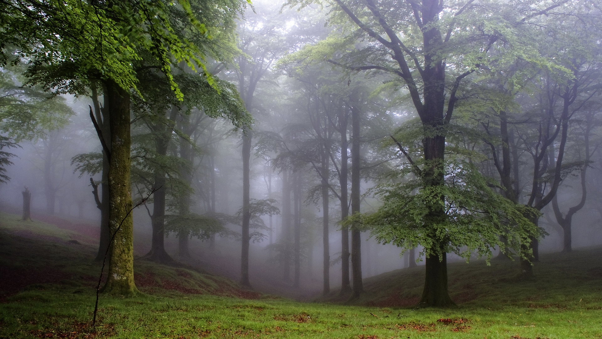 Description: A foggy forest with trees and grass on the ground and a bench in the foreground with a bench on the ground.