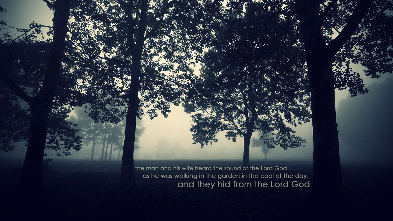 Description: A foggy forest with trees and a bible verse on it's side in black and white with a blue background.
