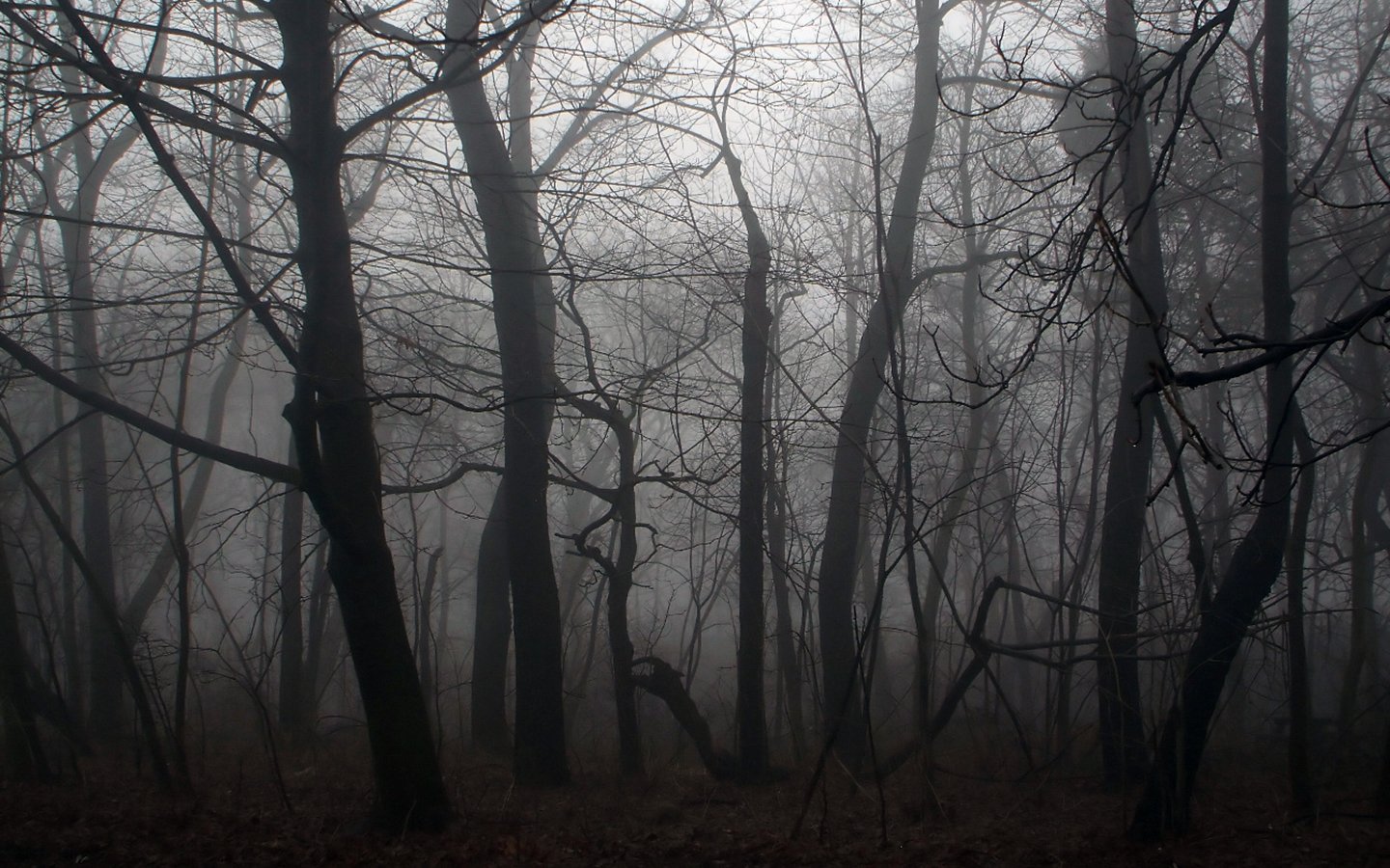 Description: A foggy forest with trees and leaves on the ground and no leaves on the ground on the ground.