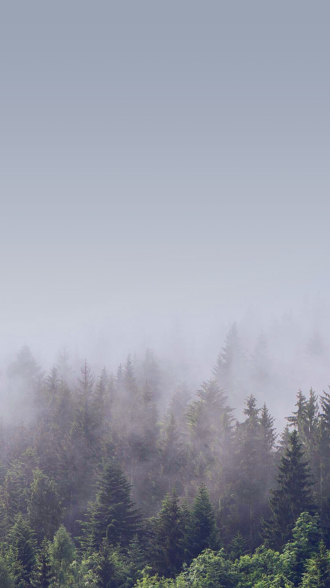 Description: A foggy forest with a few trees in the foreground and a plane flying in the background with a blue sky.