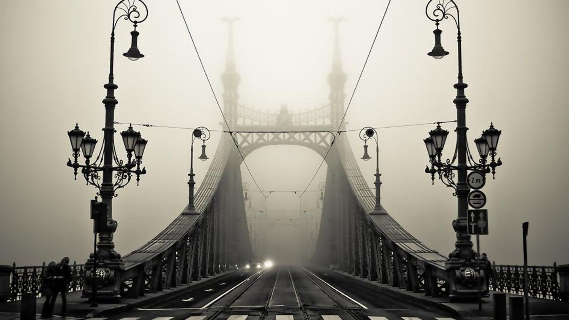 Description: A bridge with a light on it and street lamps on the side of it in the foggy day.