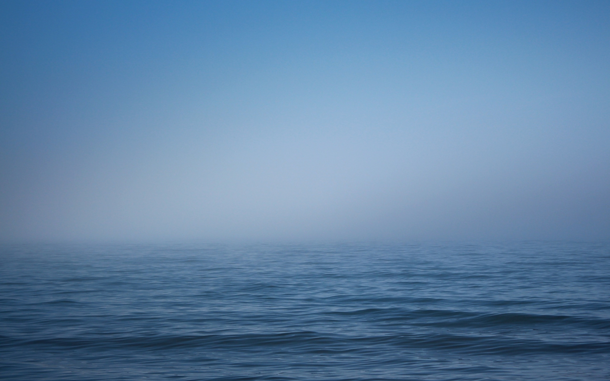 Description: A large body of water with a boat in the distance on a foggy day with a blue sky.