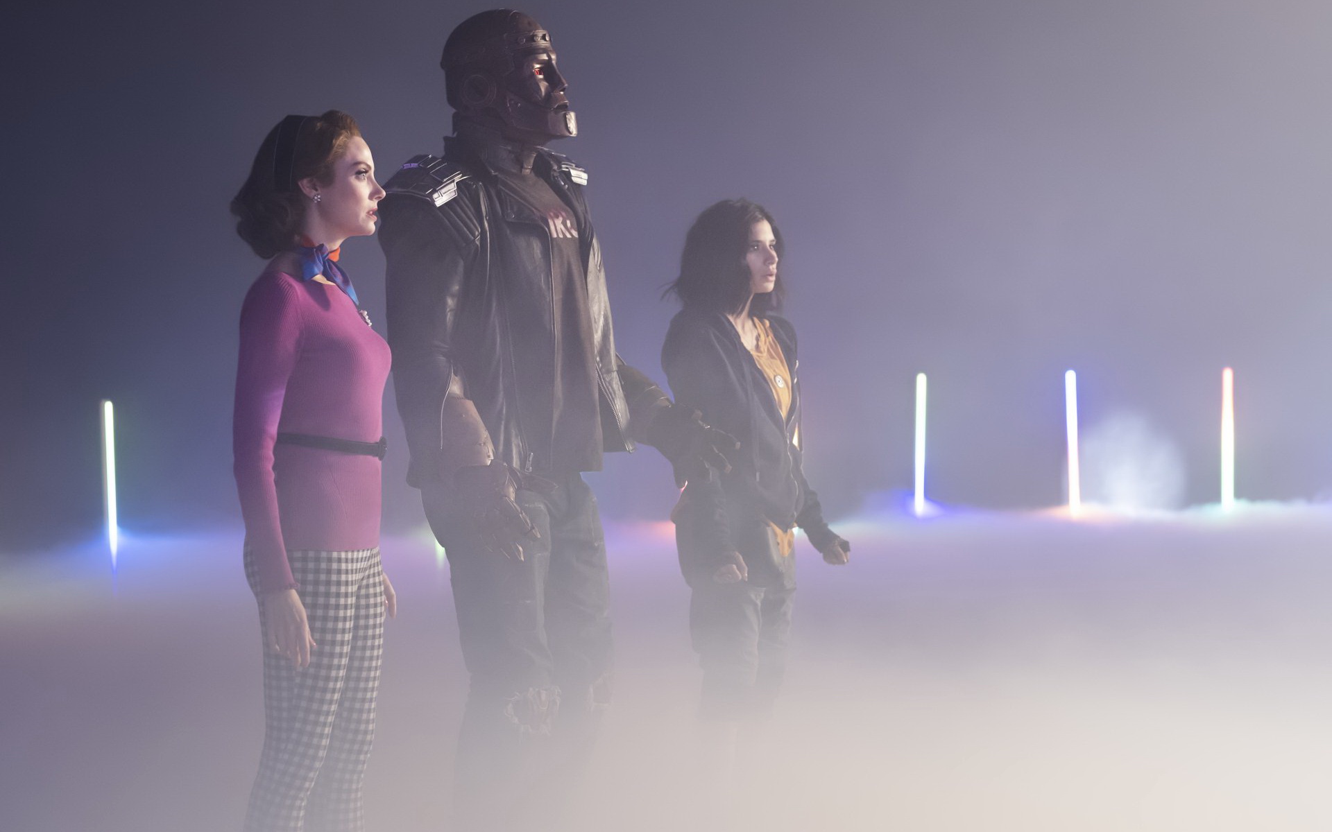 Description: A group of people standing in a foggy area with a man in a leather jacket and a woman in a pink top.