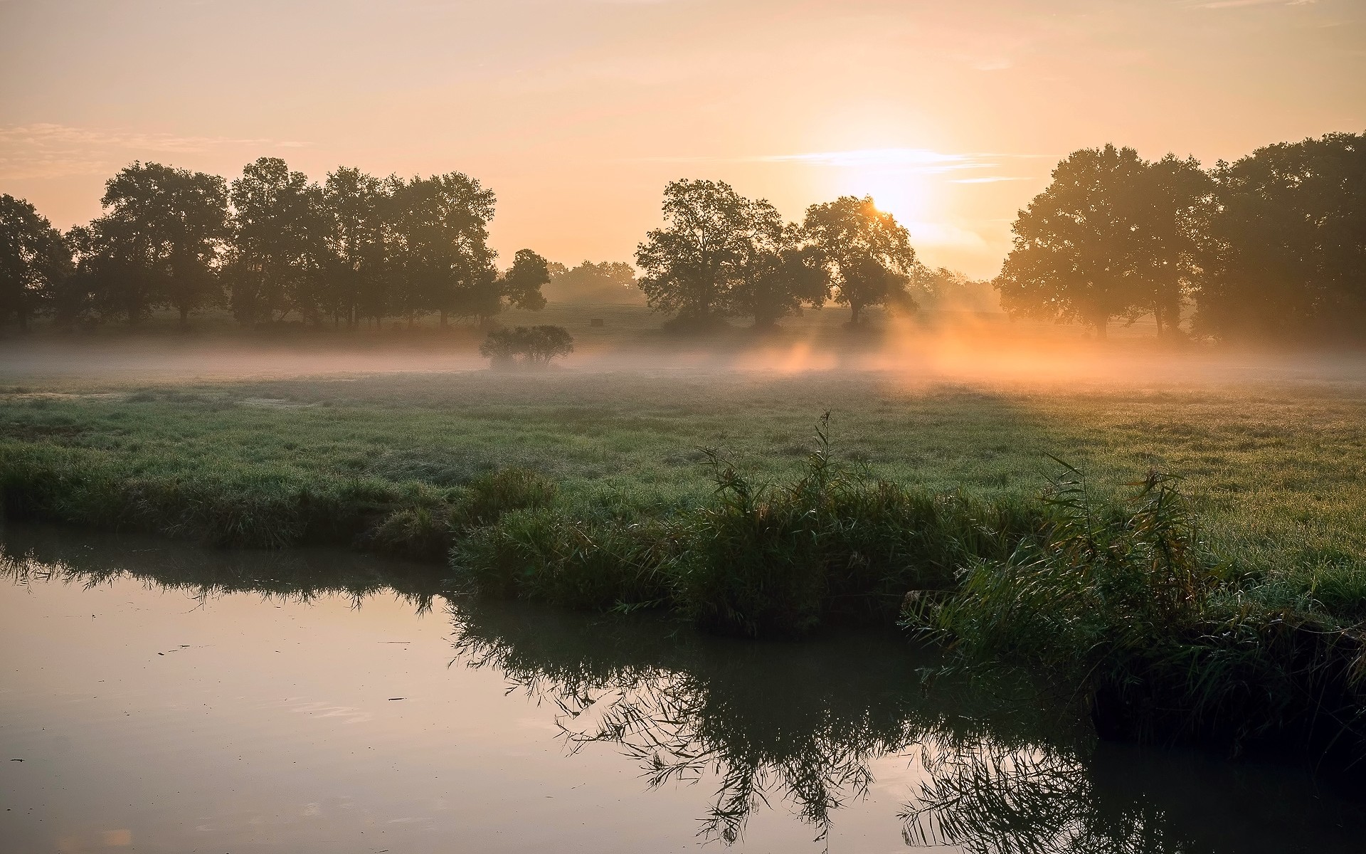 Description: A foggy field with a river in the foreground and trees in the background with a sun setting.