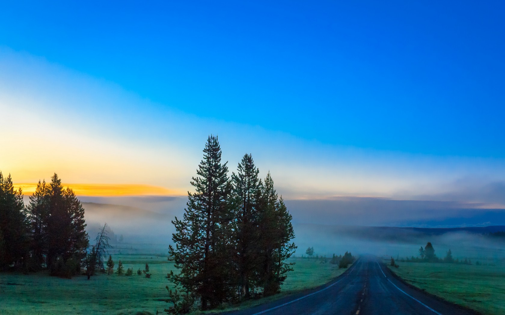 Description: A road with trees on both sides and a foggy sky in the background with a few clouds in the distance.