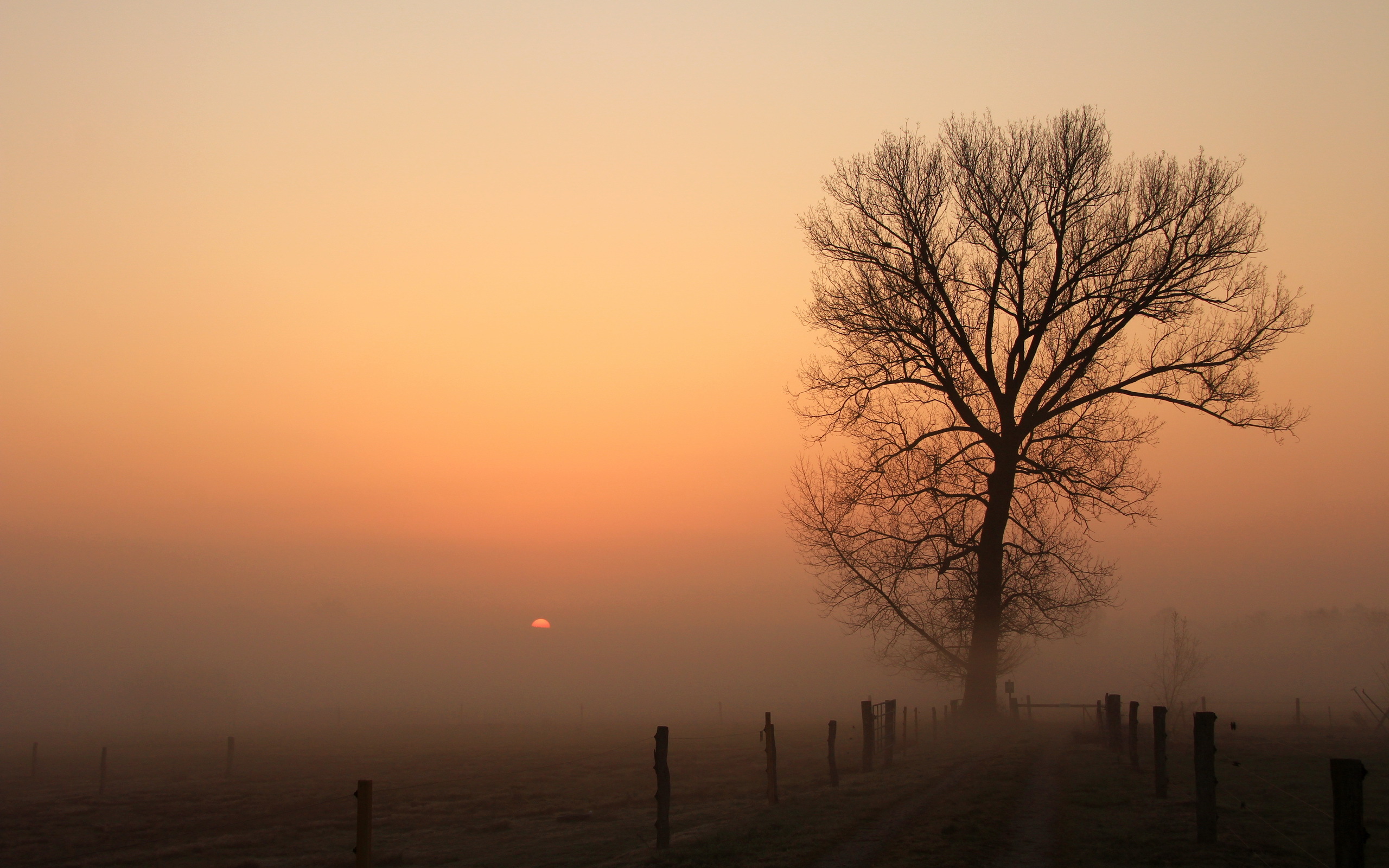 Description: A tree in the fog with a sun in the background and a fence in the foreground with a tree in the foreground.