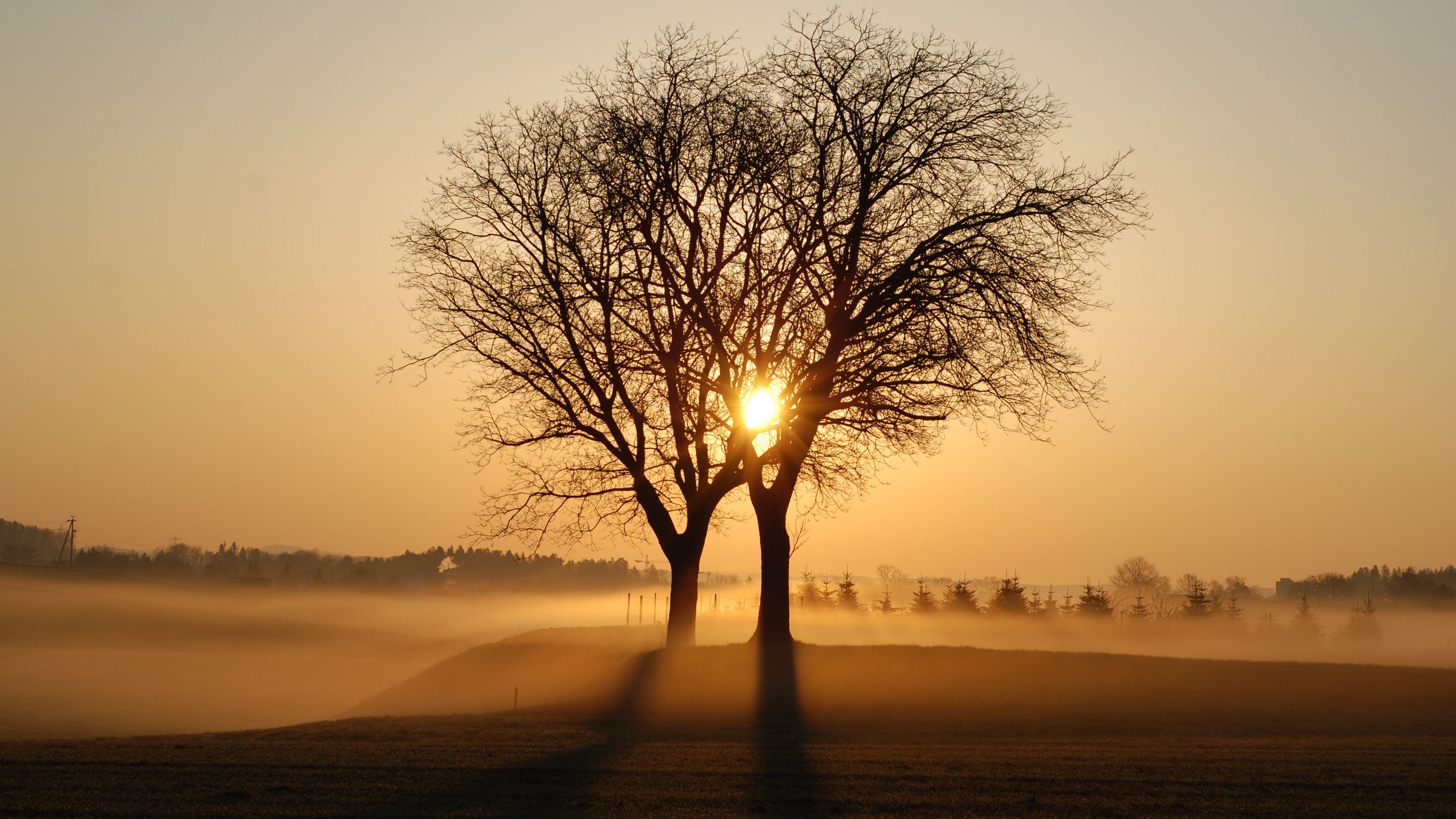 Description: A tree with no leaves in the foggy field at sunset with the sun shining through the trees and the fog.