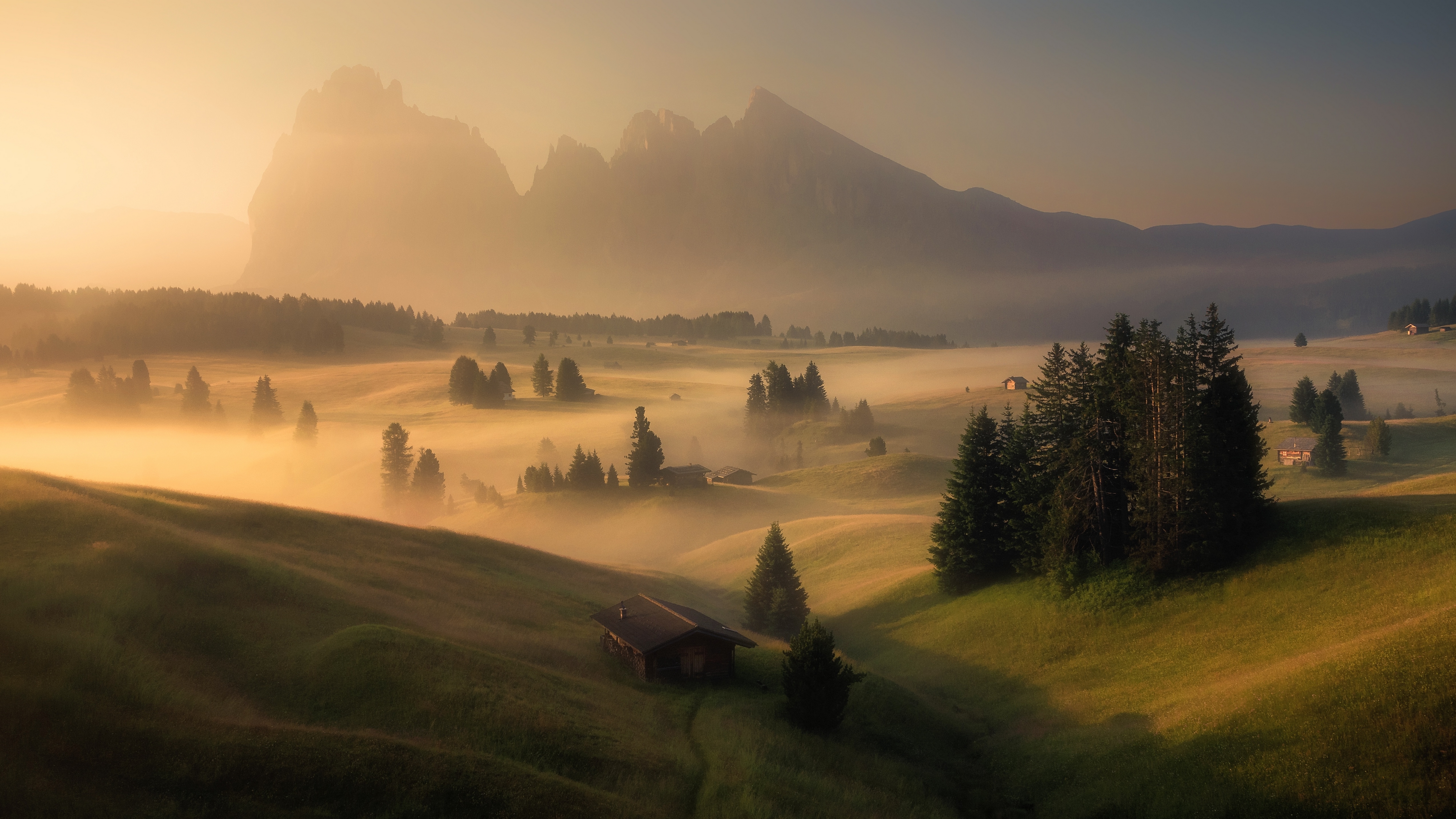 Description: A foggy valley with a small cabin in the foreground and mountains in the background with trees and grass.