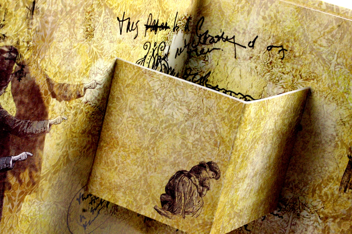 Description: A close up of a folded book with a picture of a woman holding a child on it's back.