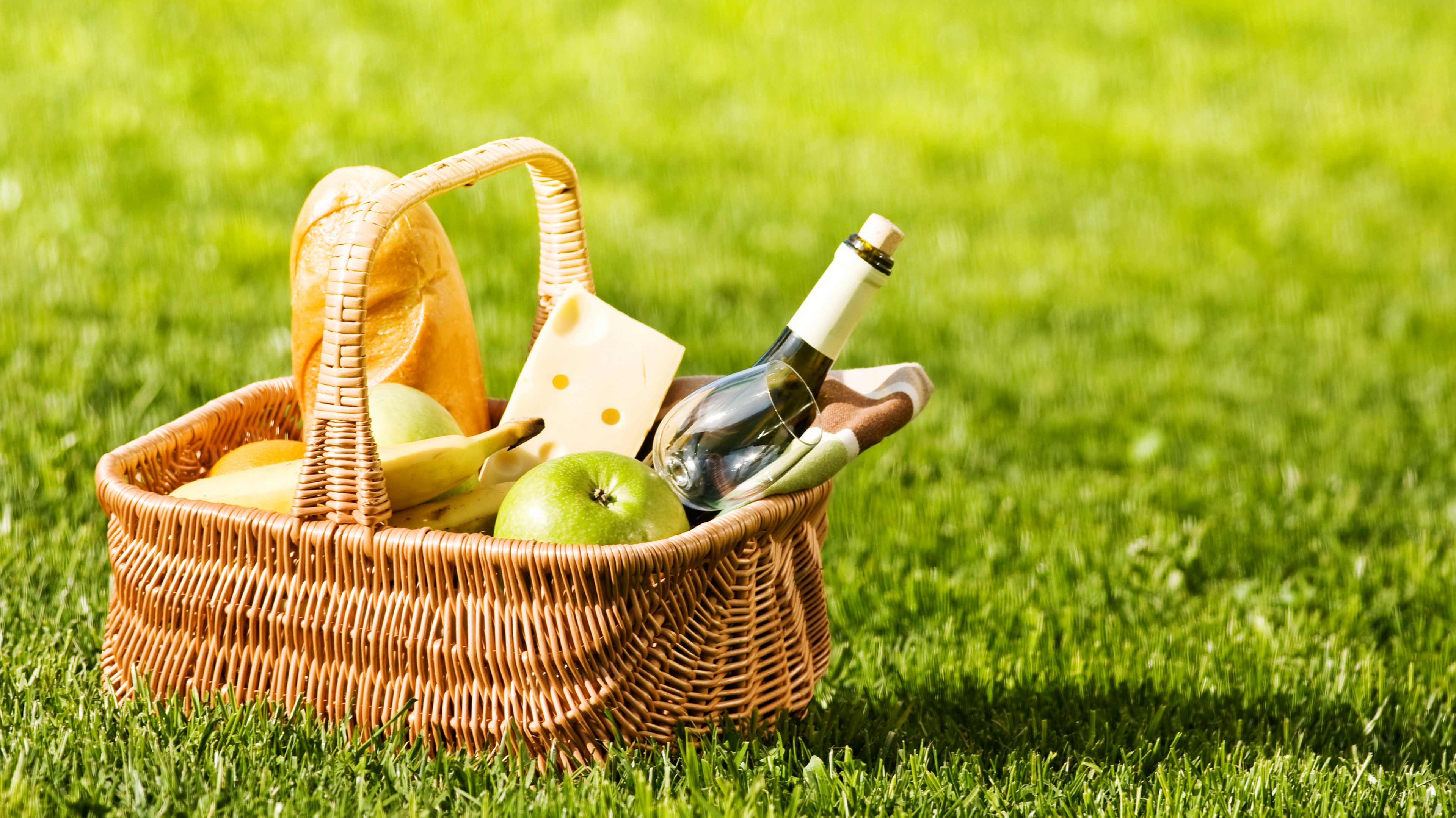 Description: A basket of food and a bottle of wine on a green lawn with grass in the background and a blurry background.