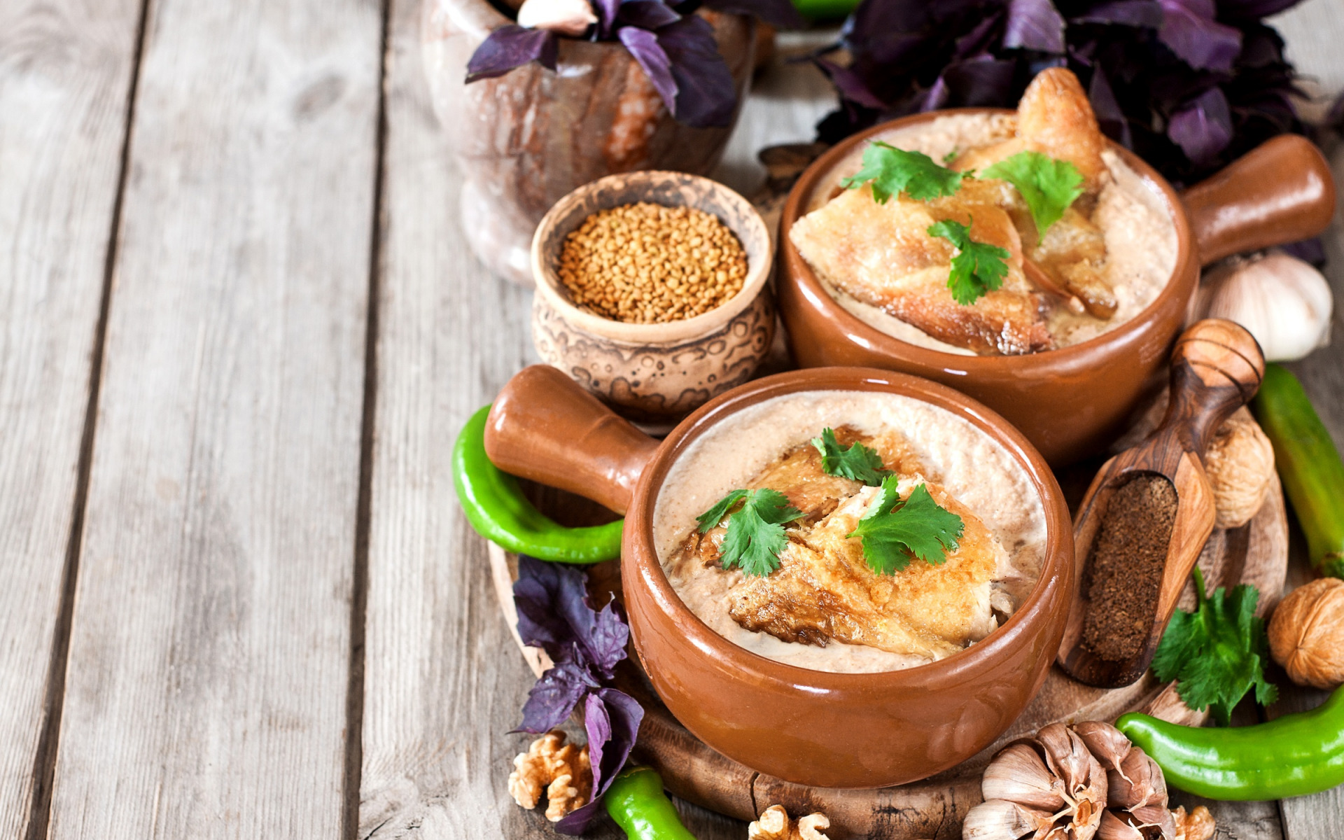 Description: A table topped with three pots filled with food and vegetables next to a pot of beans and other vegetables.