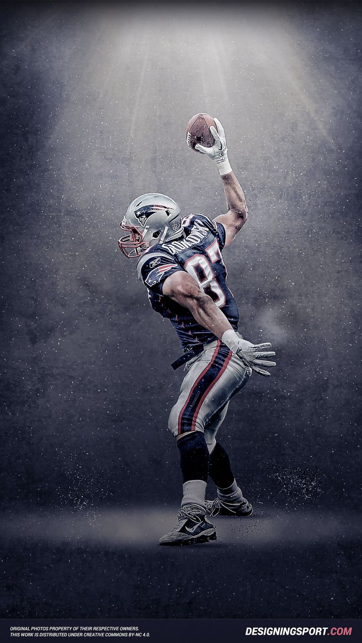 Description: A football player is holding a ball in the air with his right hand and his left hand in the air.