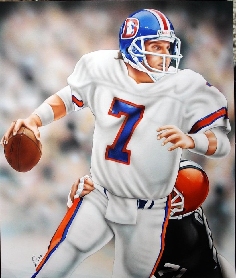 Description: A painting of a football player holding a ball in his hand and wearing a helmet and holding a football.