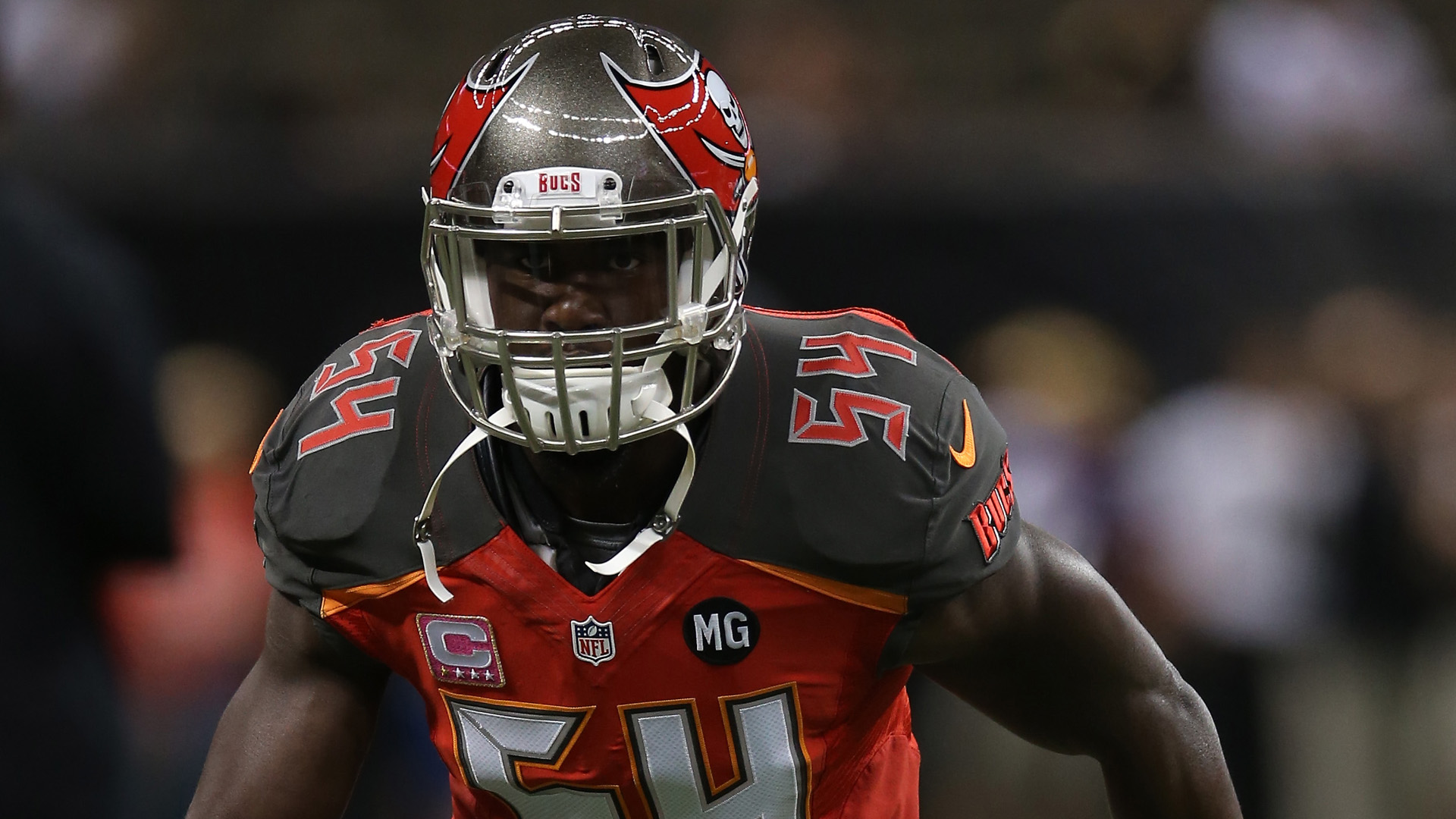 Description: A football player wearing a helmet and a helmet on his head is looking down at the ground while people watch.